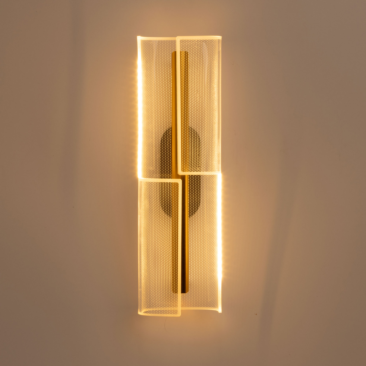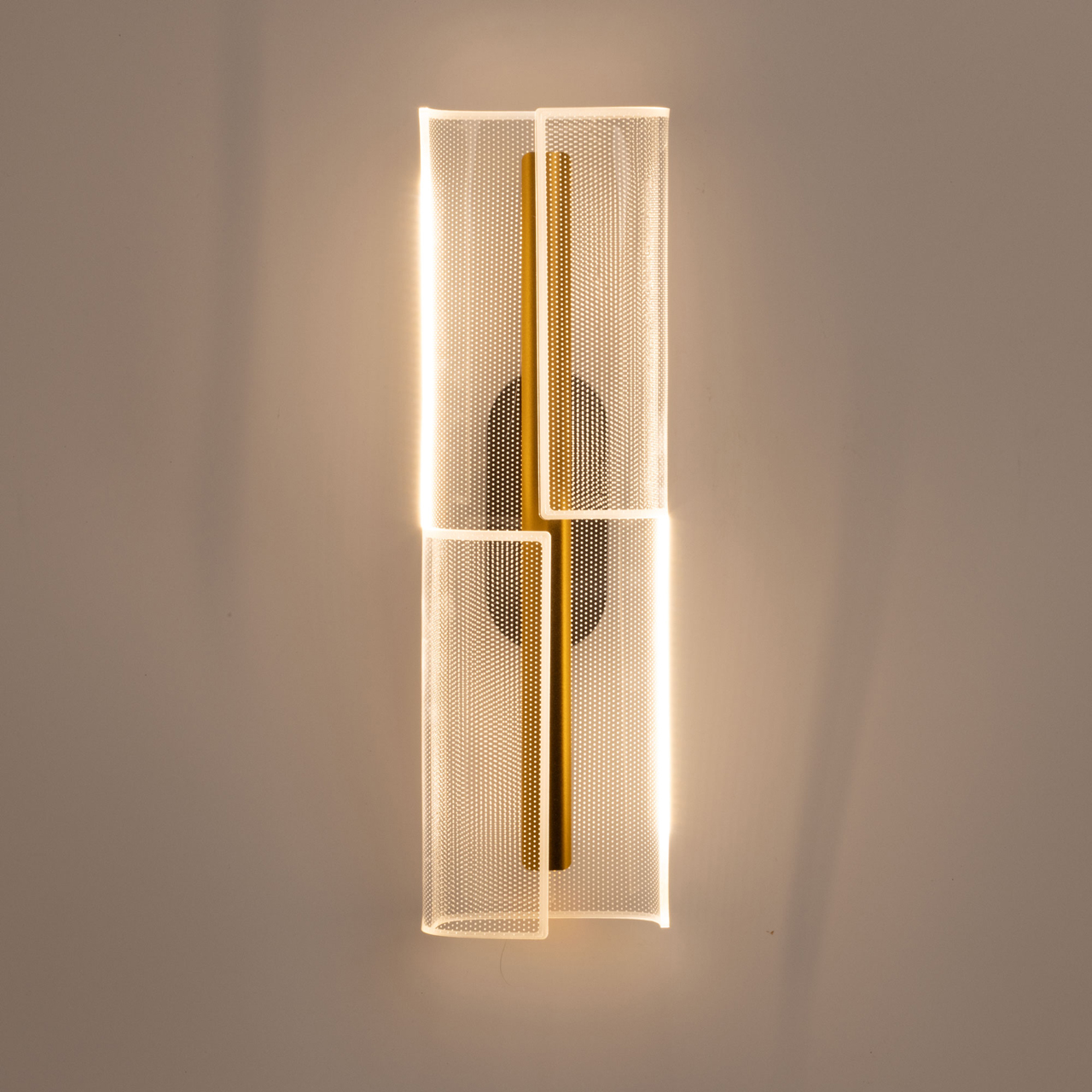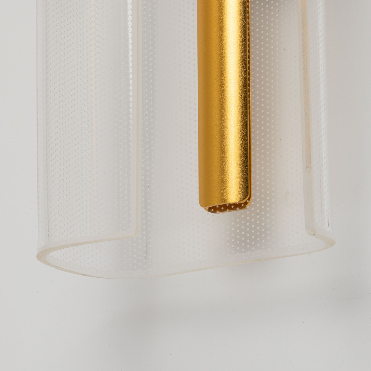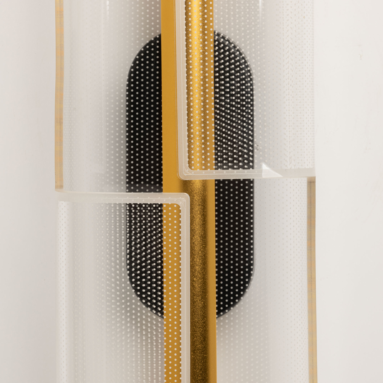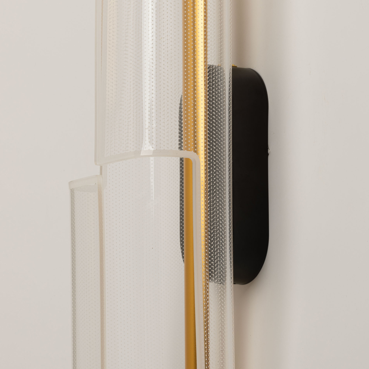 Металлический корпус настенного бра окрашен в черный цвет. Корпус плафона выполнен из сплава алюминия и окрашен в цвет золота. Настенное бра декорировано изящным элементом из прозрачного акрила с точечным рисунком.
