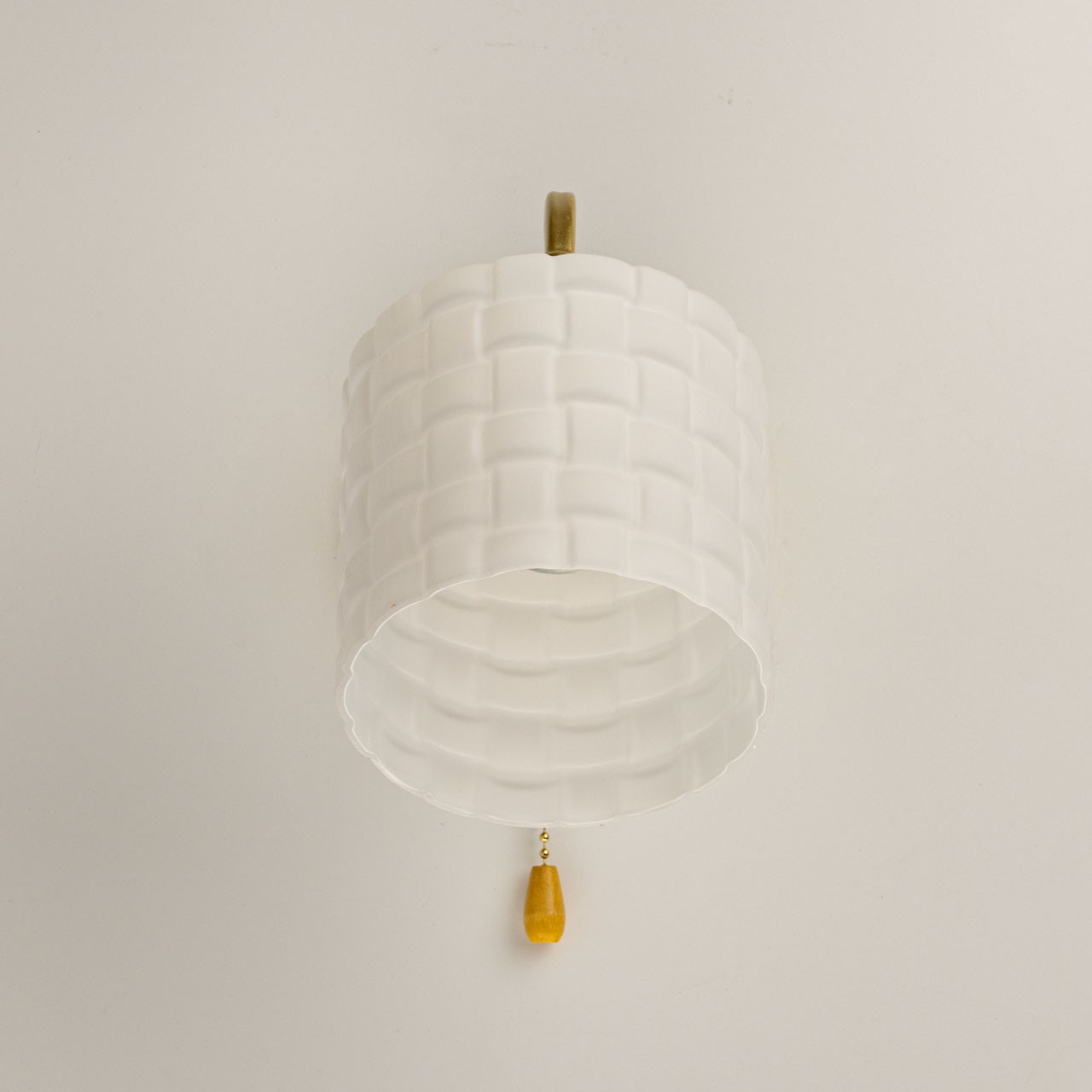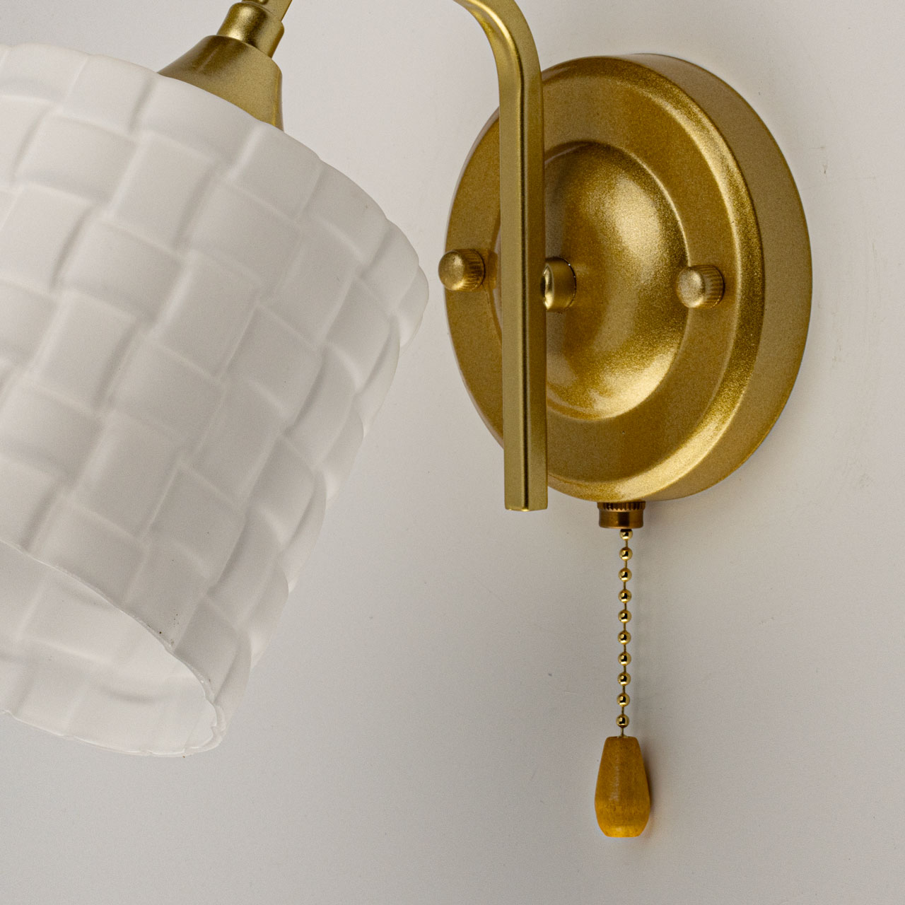 Металлическое основание бра окрашено в цвет золота. Стеклянный плафоны отлит в сложную форму и окрашен в белый цвет.