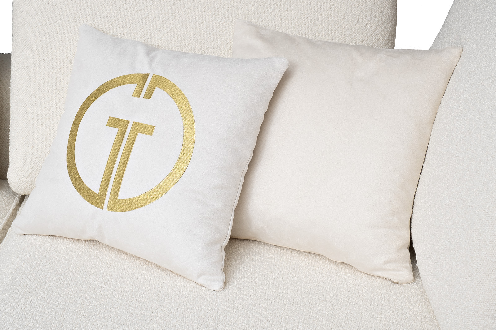 Комплект мебели №53 модульный Диван Тесоро(Tesoro) (левый угол). В состав комплекта входит: модуль угловой левый DR-1шт, модуль угловой правый KL+P- 1шт. Комплект выполнен в ткани из коллекции Garda Decor- букле Orso-Ecru. В состав комплекта входят декоративные подушки: 45*45см в ткани Атмосфера(Atmosphera)010-2шт, 45*45см в ткани Атмосфера(Atmosphera)000-2шт с вышивкой эмблема в цвет золото. Металлические опоры 18см, цвет бронза. Габариты комплекта: ширина- 3100мм, глубина-2000мм, высота- 900мм. Глубина сиденья- 750мм, высота посадочного места- 440мм.