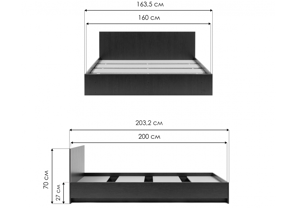 Материал каркаса - ЛДСП; Материал ортопедического основания - настил; Ширина - 163,5; Размер спального места - 160 x 200 см; Длина кровати - 203,2; Ширина кровати - 163,5; Высота изножья - 27; Высота изголовья - 70; Длина - 203,2;