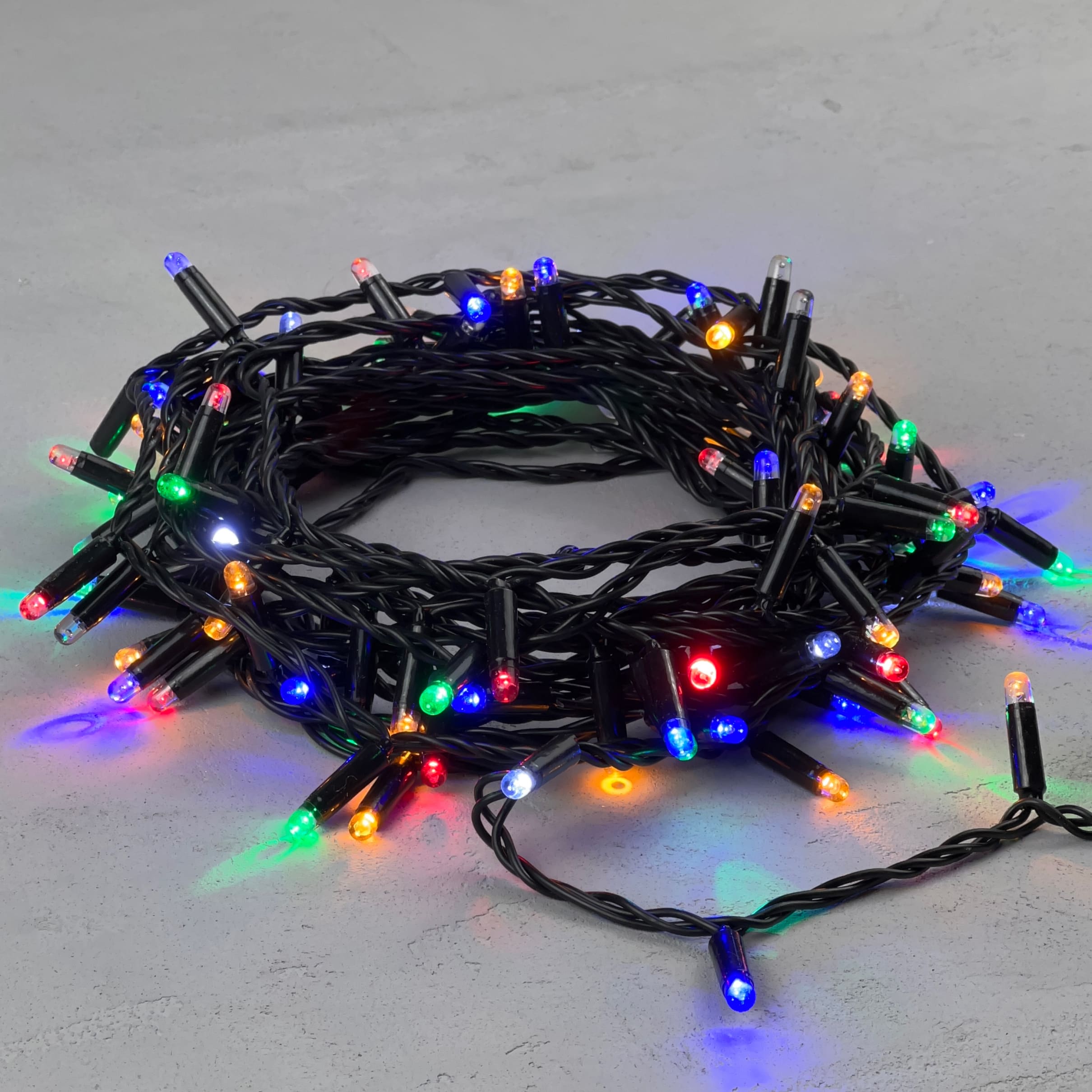 Купить "Гирлянда Нить с Колпачком 10м Разноцветная с Мерцанием Белого Диода 220В, 100 LED, Провод Черный ПВХ LTC PST100BLWCAP-11-2M"