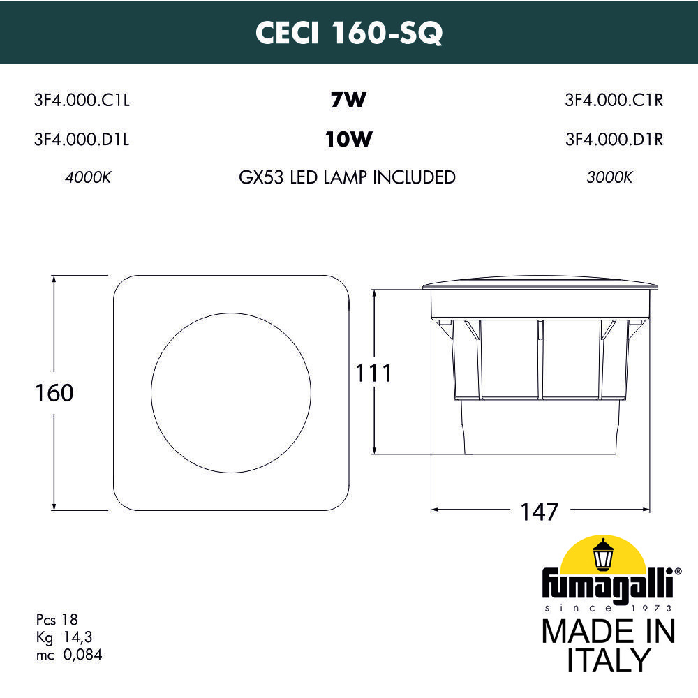 Грунтовые светильники FUMAGALLI серии CECI, модель CECI 160-SQ - изготовлены в Италии. Основное предназначение - подсветка снизу фасадов зданий, элементов ландшафта, кустов, деревьев, светового дизайна, освещения парковок и парковых дорожек. Так же может использоваться для декоративного и технического освещения внутри помещений. Устанавливается в дорожное покрытие, полы, отмостку фундаментов зданий, газоны и другие горизонтальные поверхности. Светильник CECI расчитан на сложные условия эксплуатации: на него можно наезжать автомобильным колесом, ходить по нему, светильник не боится льда, воды, механической уборки. Сначала в поверхность монтируется и закрепляется закладной элемент "стакан", в который выводится электрический провод. Далее в данный закладной элемент устанавливается сам уличный светильник CECI и подключается электропитание. Корпус изготовлен из современного вандалостойкого, негорючего полимера RESIN не требующего окраски. Прочного, окрашенного в массе, не ржавеющего и не выгорающего на солнце. Все светильники пыле-влаго защищены по стандарту IP66. Корпус ландшафтного светильника не проводит электричество, относится к 2 классу электробезопасности. Рассеиватель выполнен из антивандального, не мутнеющего и не горючего PMMA. Срок службы светильника - не менее 20 лет. Не требуется трансформатор. Напряжение питания - 220 В. Температура использования от -60 до +90. При заказе требуется выбрать цвет корпуса.