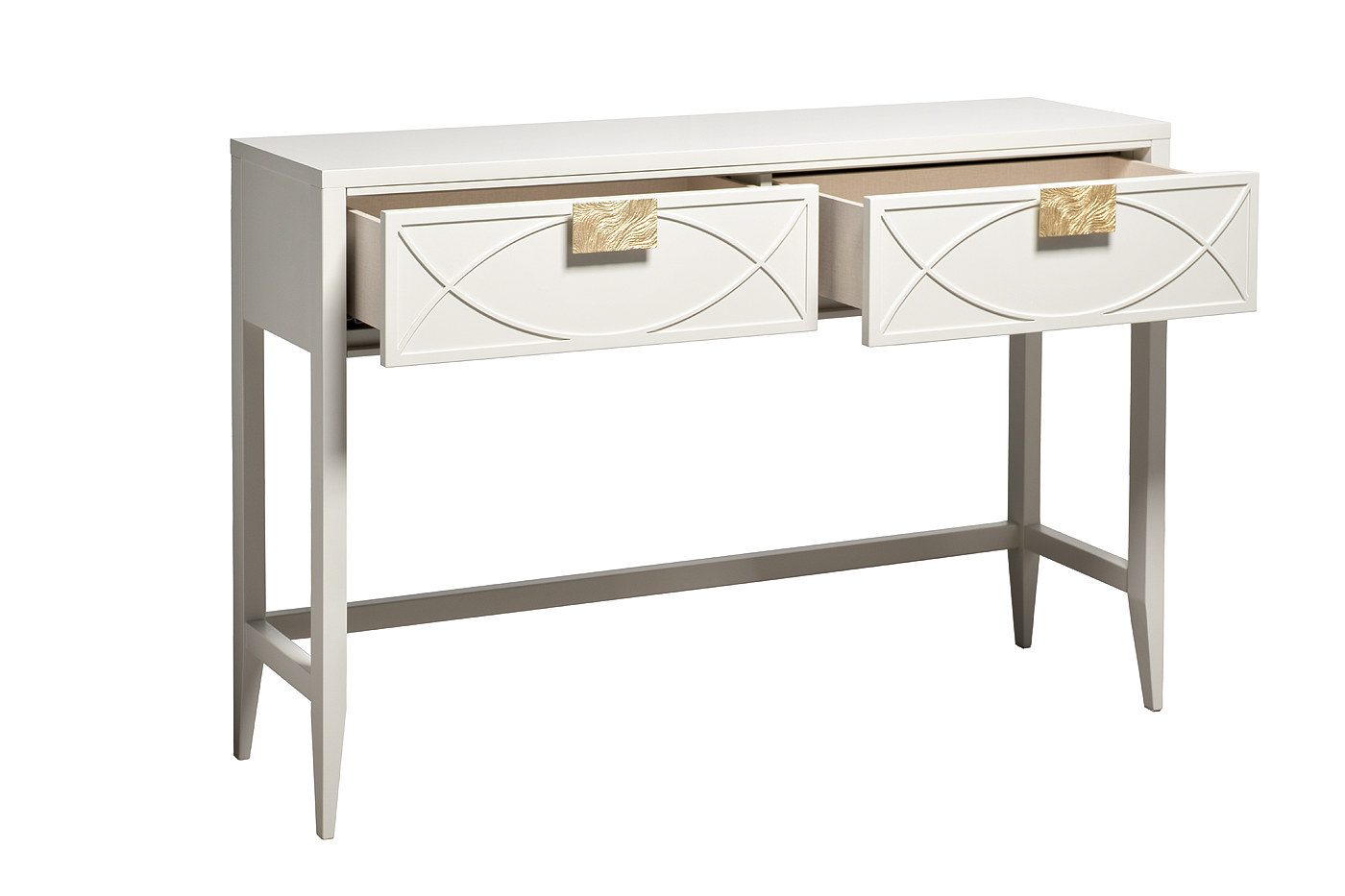 Дизайнерская консоль в стиле ар-деко - авторская разработка студии Garda Decor. Бежевый матовый фасад украшен объемным дугообразным декором и широкими рельефными ручками цвета матовое золото. Два выдвижных ящика прекрасно подойдут для хранения щеток, косметики и прочих мелочей. Тонкие ножки придают конструкции легкость и изящество. Эксклюзивная консоль станет гармоничным дополнением интерьера прихожей, спальни или гостиной. Размер: ширина- 120см, высота- 80см, глубина- 35см.На нашем сайте представлены ТВ-тумба арт.151SV-00004, комод арт.151SV-00006, прикроватная тумба арт. 151SV-00007