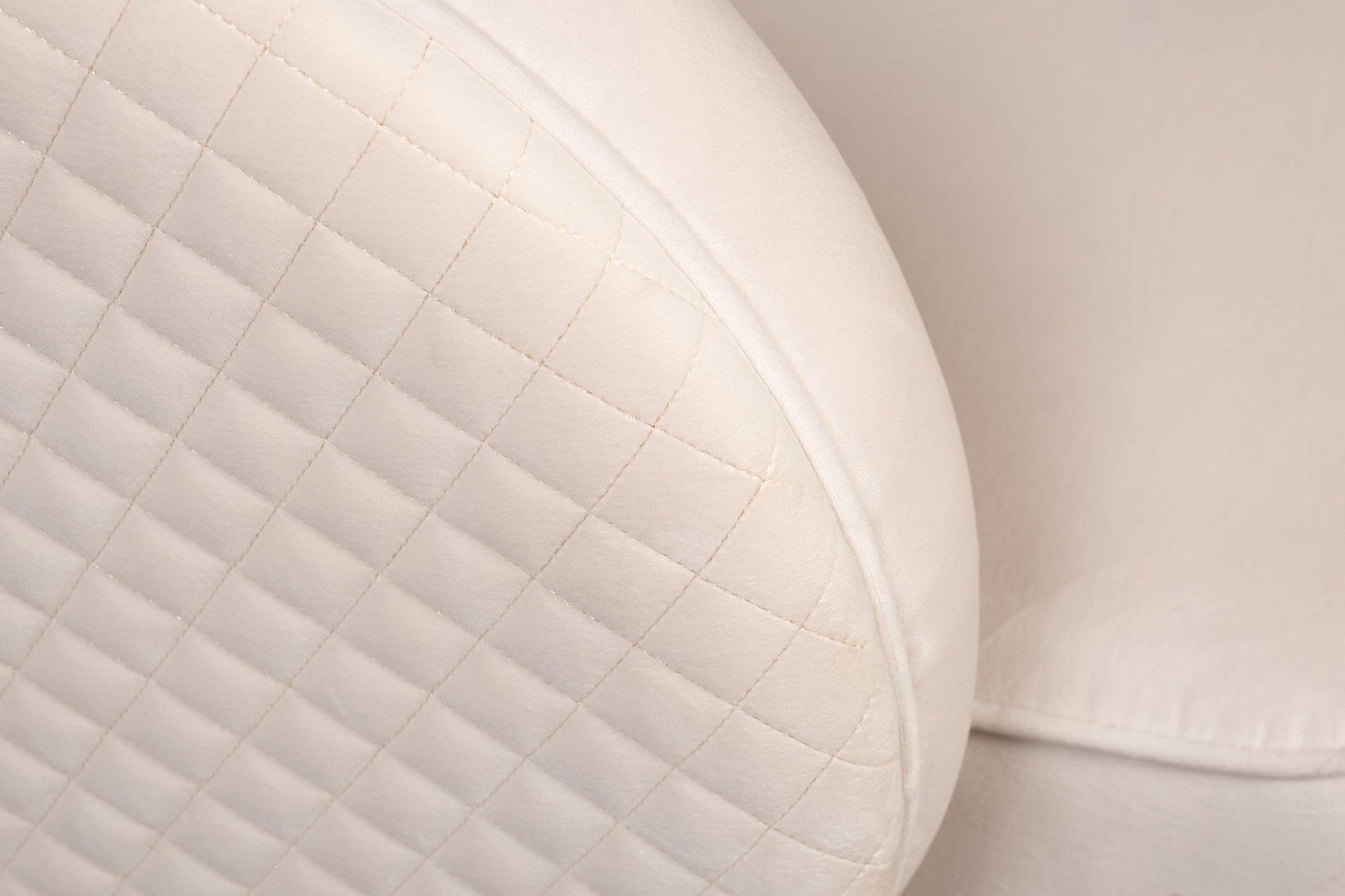 Мебель светлых оттенков - современный тренд. В данном кресле сочетается мягкий велюр нежного оттенка слоновой кости, золотое основание из нержавеющей стали и простроченная спинка.