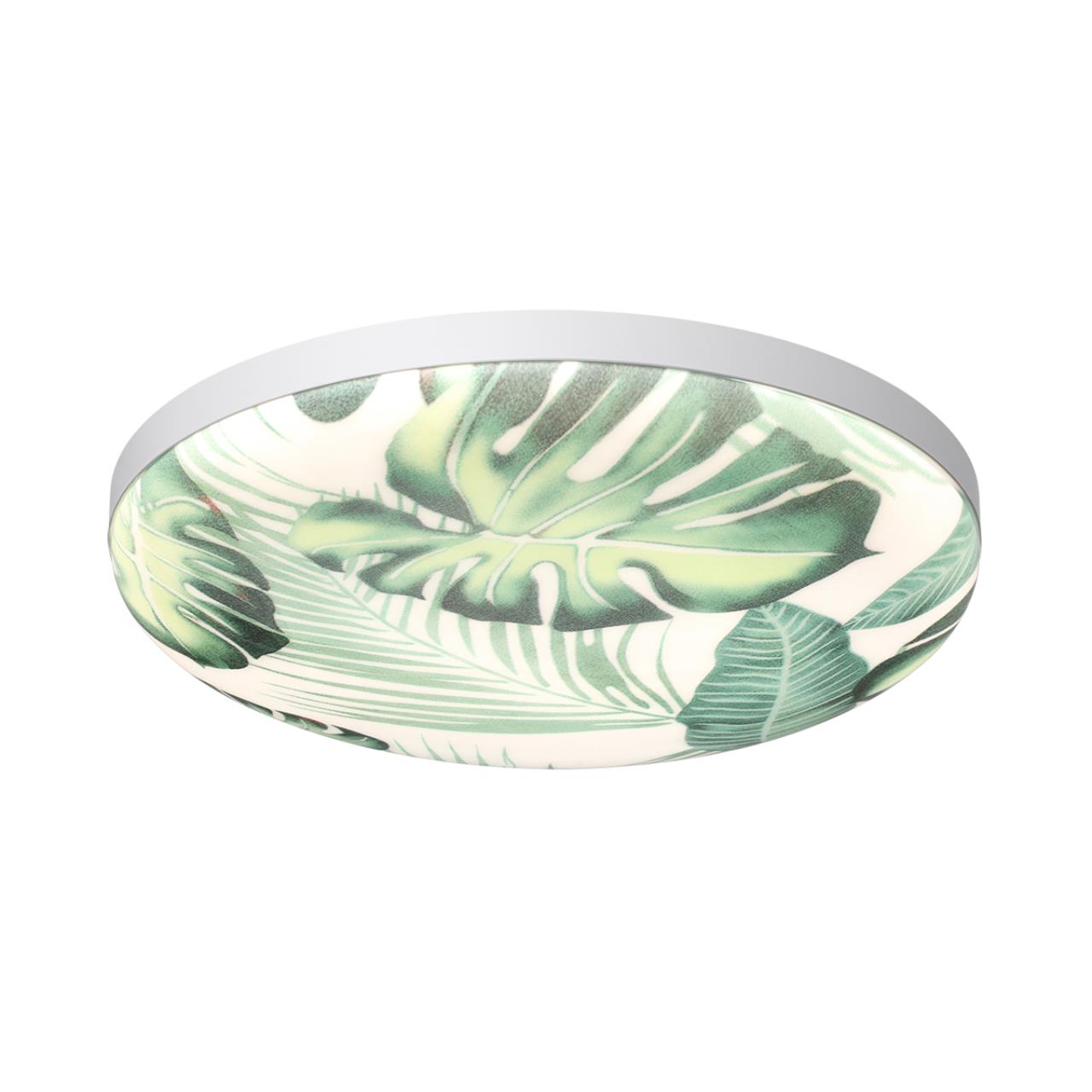 Изумительная модель 7748/EL от Итальянского производителя ODEON LIGHT относится к коллекции FLORI .Светильник состоит из металлического основания (базы) и пластикового рассеивателя. Материал рассеивателя - высококачественный пластик марки PMMA 2.0 белого цвета с глянцевой поверхностью, обеспечивающий светильнику равномерное рассеивание и хорошее светопропускание. Форма плафона: круглая, декорирована орнаментом на плафоне с зеленым рисунком тропических листьев и съемным ободом белого цвета. Рисунок на плафоне выполнен методом цифровой печати по технологии прямого нанесения красок на акриловый лист. С целью предотвращения выцветания красок поверх рисунка наносится слой белой краски. После выдувания плафона при высоких температурах красочный рисунок приобретает стойкость и долговечность. Степень защиты IP43 позволяет использовать светильник в определенных зонах влажных помещений. В комплект входит заменяемый LED модуль с линзами, мощностью 70Вт, которая соответствует лампе накаливания 610Вт. А также пульт ДУ, с помощью которого осуществляется плавное изменение цветовой температуры 3000-6000. Данную модель 7748/EL с быстрой доставкой спешите купить в магазине 220svet.ru