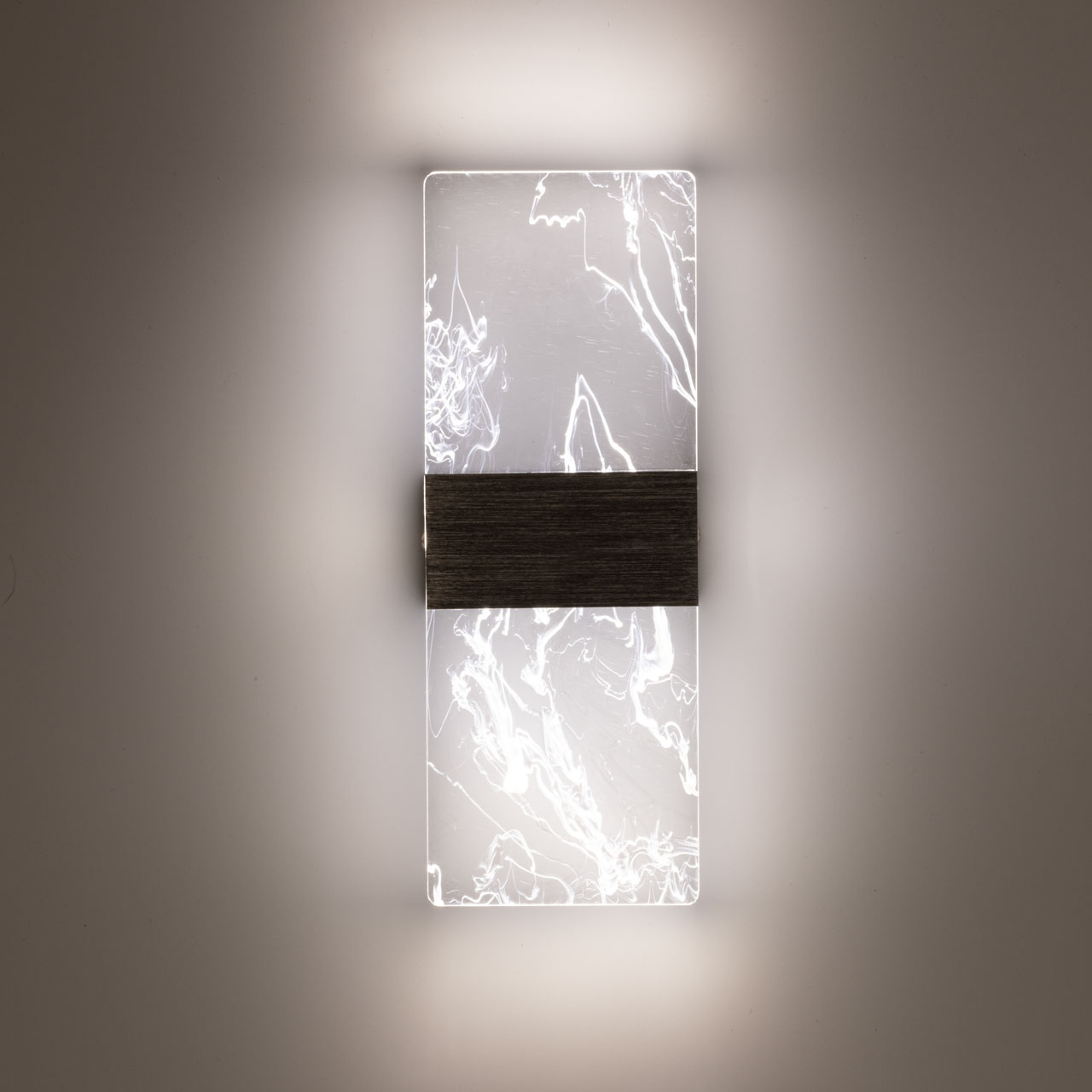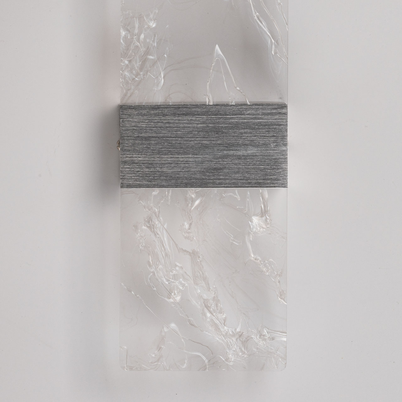 Металлическое основание настенного бра окрашено в цвет серебра. Основа плафона выполнена из сплава алюминия с цинком, обработана по технологии брашинг и оксидирована. Настенное бра декорировано полупрозрачным акриловым плафоном с декоративными белыми разводами.