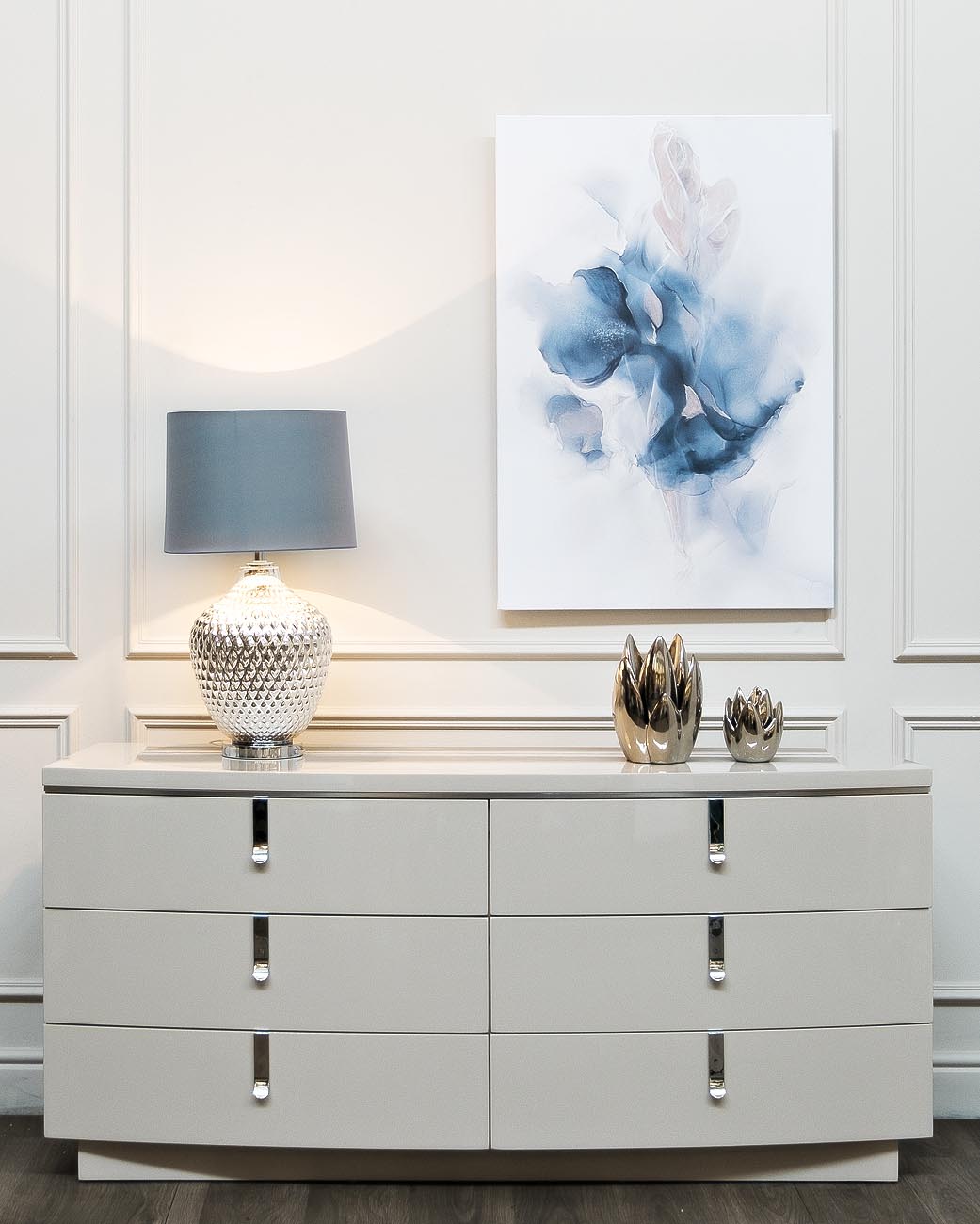 Настольная лампа со стеклянным основанием серебристого цвета и сине-серым абажуром создает изысканную и богемную обстановку в комнате, наполняя ее мягким прохладным светом. Аристократичное сочетание цвета и формы позволяют разместить лампу как в кабинете, так и в спальной комнате. Лампа будет прекрасно сочестаться с зеркалами и серебристо-серыми элементами декора.