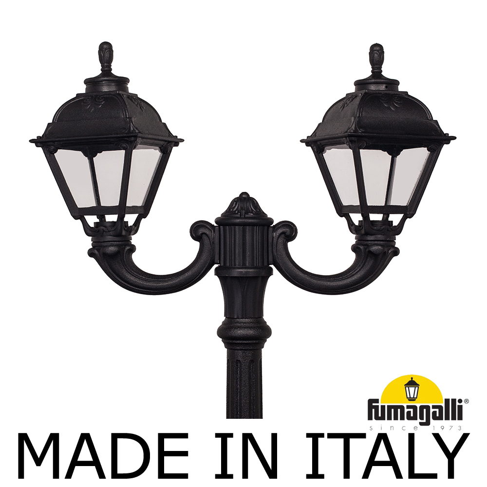 Парковый фонарь FUMAGALLI среднего размера серии CEFA, модель TABOR OFIR/CEFA 2L. Парковый фонарь с 2 светильниками, на консолях OFIR среднего размера, установленных на классическом столбе TABOR высотой 3,0 м (+высота фонарей на кронштейнах). Изготовлены в Италии, по уникальным технологиям "FUMATECH" из современного композитного полимера RESIN. Этот материал в 5 раз прочнее металла, не ржавеет, не окисляется, не выгорает на солнце, его не нужно красить. Все светильники пыле-влаго защищены по стандарту IP55 (Пылезащищенные, защита от водяных струй с любого направления). Рассеиватель выполнен из антивандального, не мутнеющего и не горючего PMMA (ПолиМетилМетаАкрилат). Срок службы светильника - не менее 20 лет. Температура использования от -60 до +90. В серии CEFA есть садовые фонари в настенном (OFIR/CEFA, MIRRA/CEFA) подвесном (SICHEM/CEFA) и наземном исполнении (IAFAET.R/CEFA, ALOE.R/CEFA, ARTU/CEFA, GIGI/CEFA, RICU/CEFA, NEBO/OFIR/CEFA 1L, NEBO/OFIR/ANNA 2L, TABOR/ADAM/CEFA 3L) со столбами разной высоты, с разным количеством и конфигурацией голов. Консоли настенных фонарей и кронштейны светильников на столбах освещения могут устанавливаться в положение вверх и вниз. Столбы выше 150 см имеют в основе мощную стальную трубу с двойной оцинковкой. При заказе требуется выбрать цвет корпуса, цвет плафона и тип патрона (Е-27 или LED GX-53). Возможен светодиодный вариант. По стилю и дизайну серия уличных светильников CEFA похожа на светильники большого размера серии SIMON . По размеру относится к средним парковым светильникам как серия RUT и GLOBE 300.