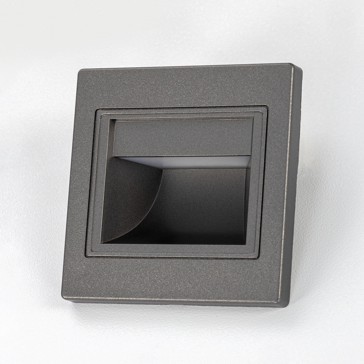 Светильник квадратной формы, корпус изготовлен из прочного полимера цвета графит. Для удобства монтажа, поставляется в комплекте с установочной коробкой.