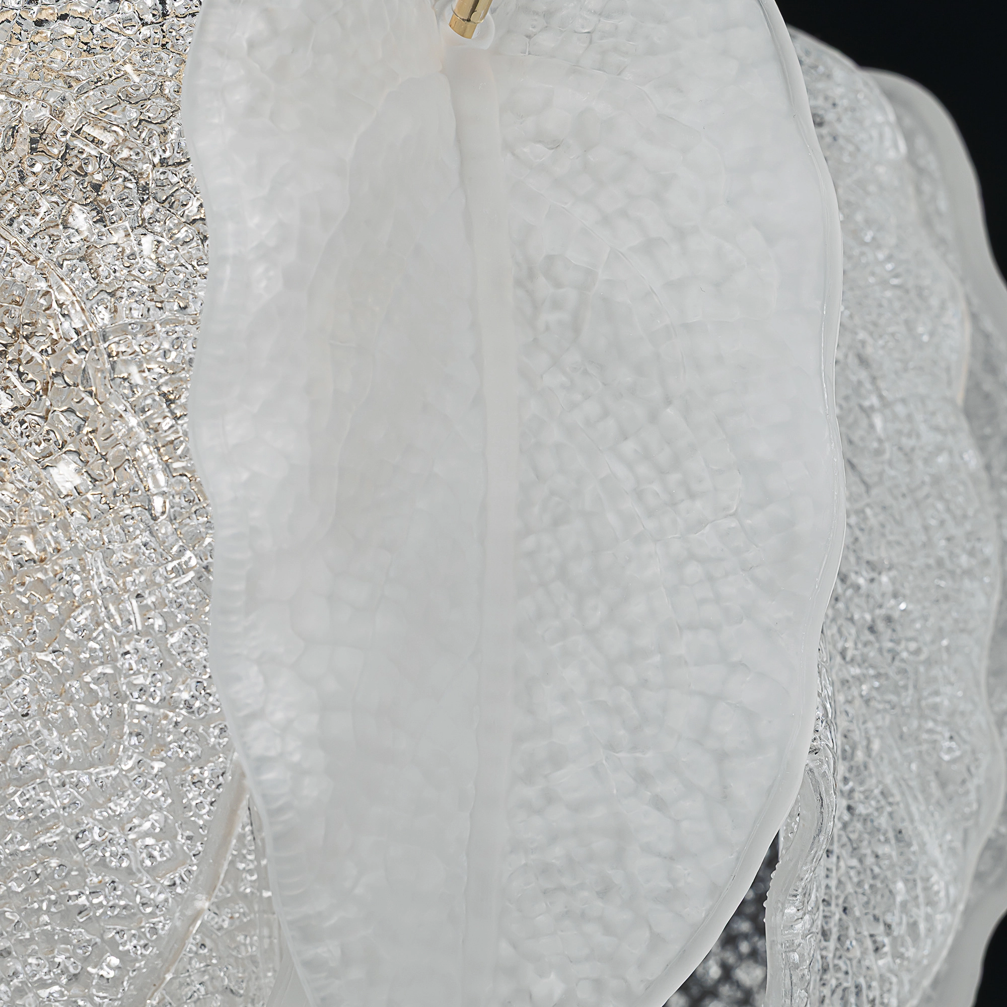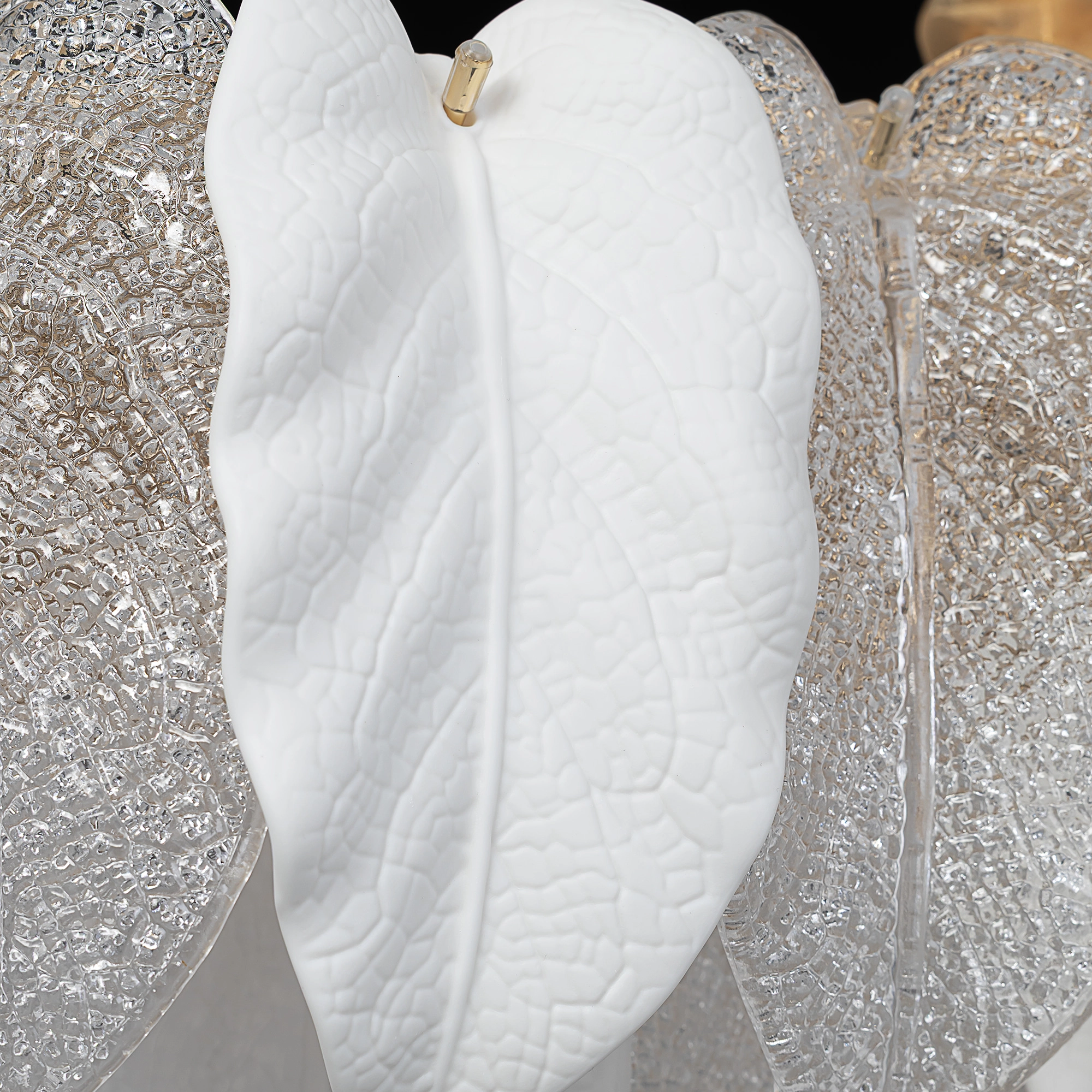 Металлический каркас золотистого оттенка переливается в лучах света. Листья из полуматового и прозрачного рифленого стекла, белой керамики, а также металлические листья с прожилками, отлитые по ювелирной технологии, подчеркивают флористическую изысканность и четкость силуэта люстры. В изделии используются 16 лампочек с цоколем Е14, высоту подвесных цепей можно отрегулировать.