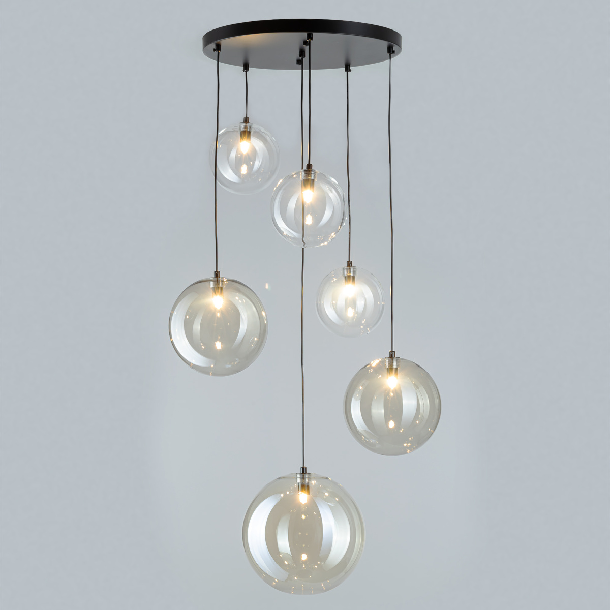 Каскадная люстра Citilux ORTON CL202163 представляет собой гармоничное сочетание строгих линий и воздушной лёгкости. Металлическое основание в форме идеального круга с чёрным матовым покрытием служит надёжной основой для подвесных стеклянных шаров. Прозрачные, с золотистым оттенком шампань и дымчатые плафоны (размером 15, 20 и 25см) превращают люстру в художественный элемент даже при выключенном свете.