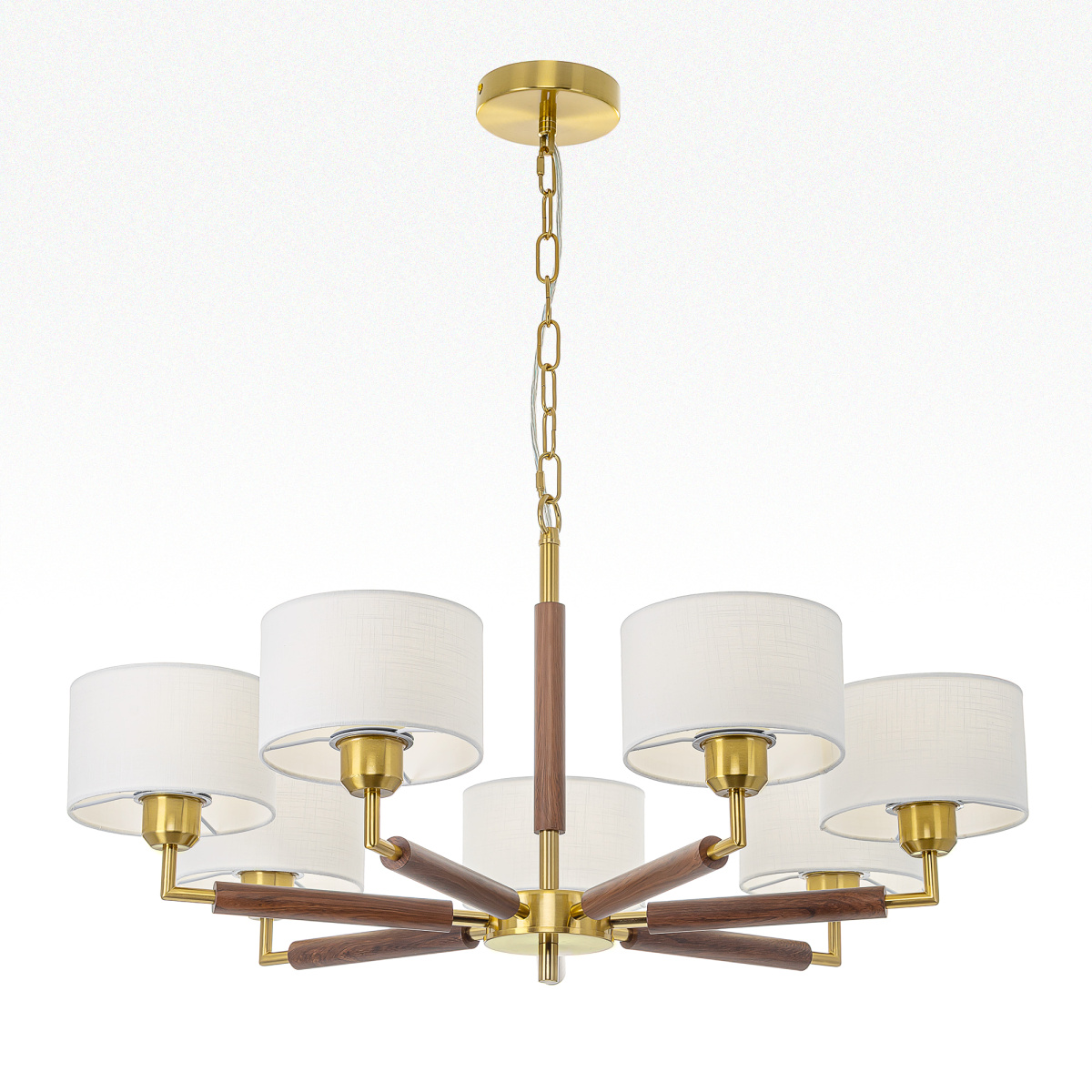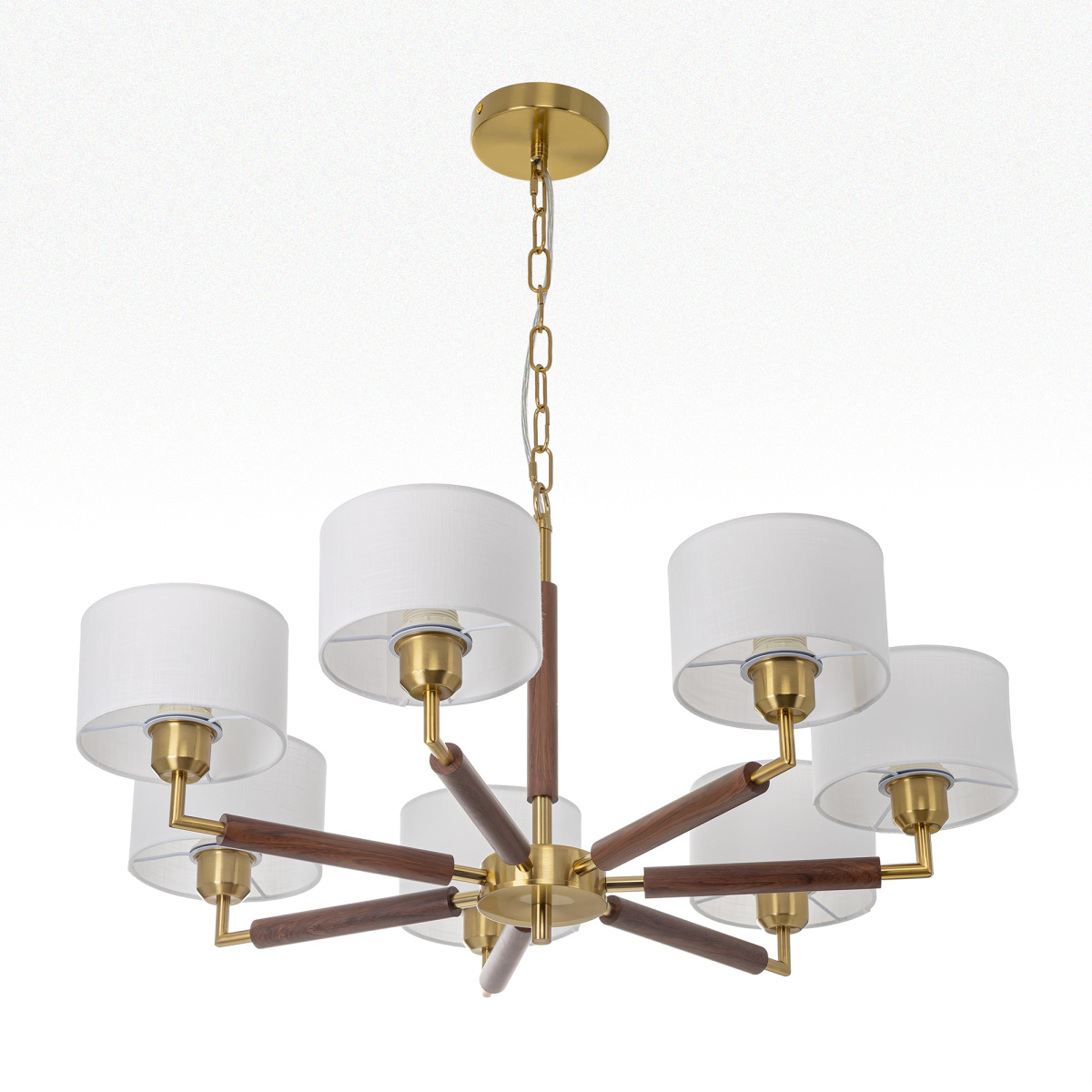 Бронзовый металлический каркас с декоративными элементами с текстурой под дерево. Семь рожков с абажурами в форме цилиндра, изготовленных из молочно-белой ткани с чуть шероховатой текстурой.