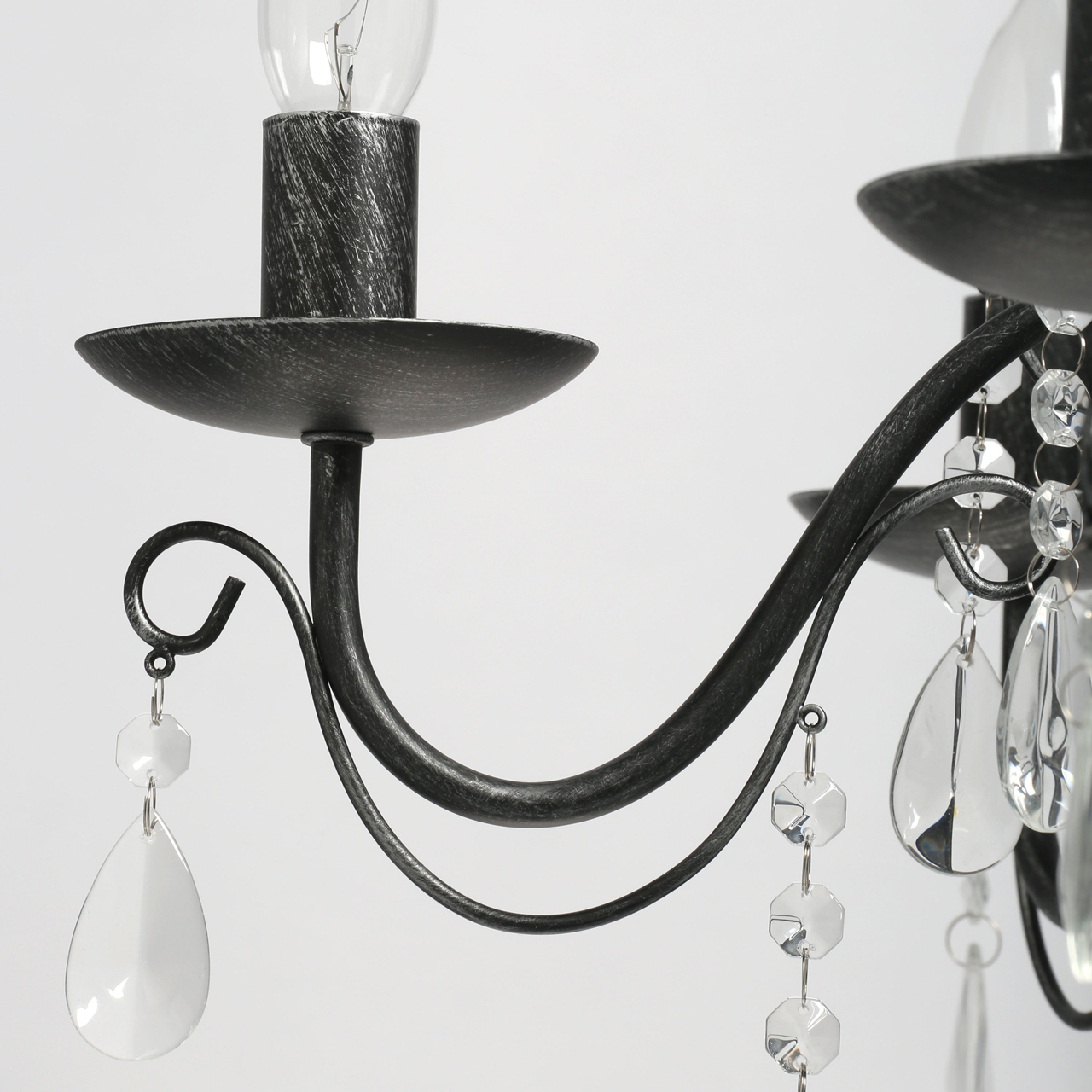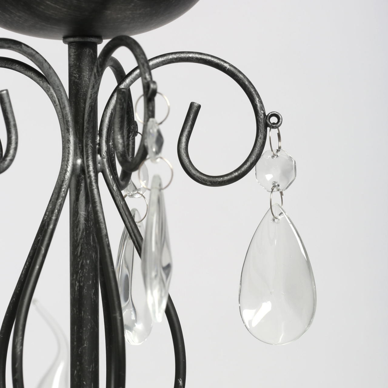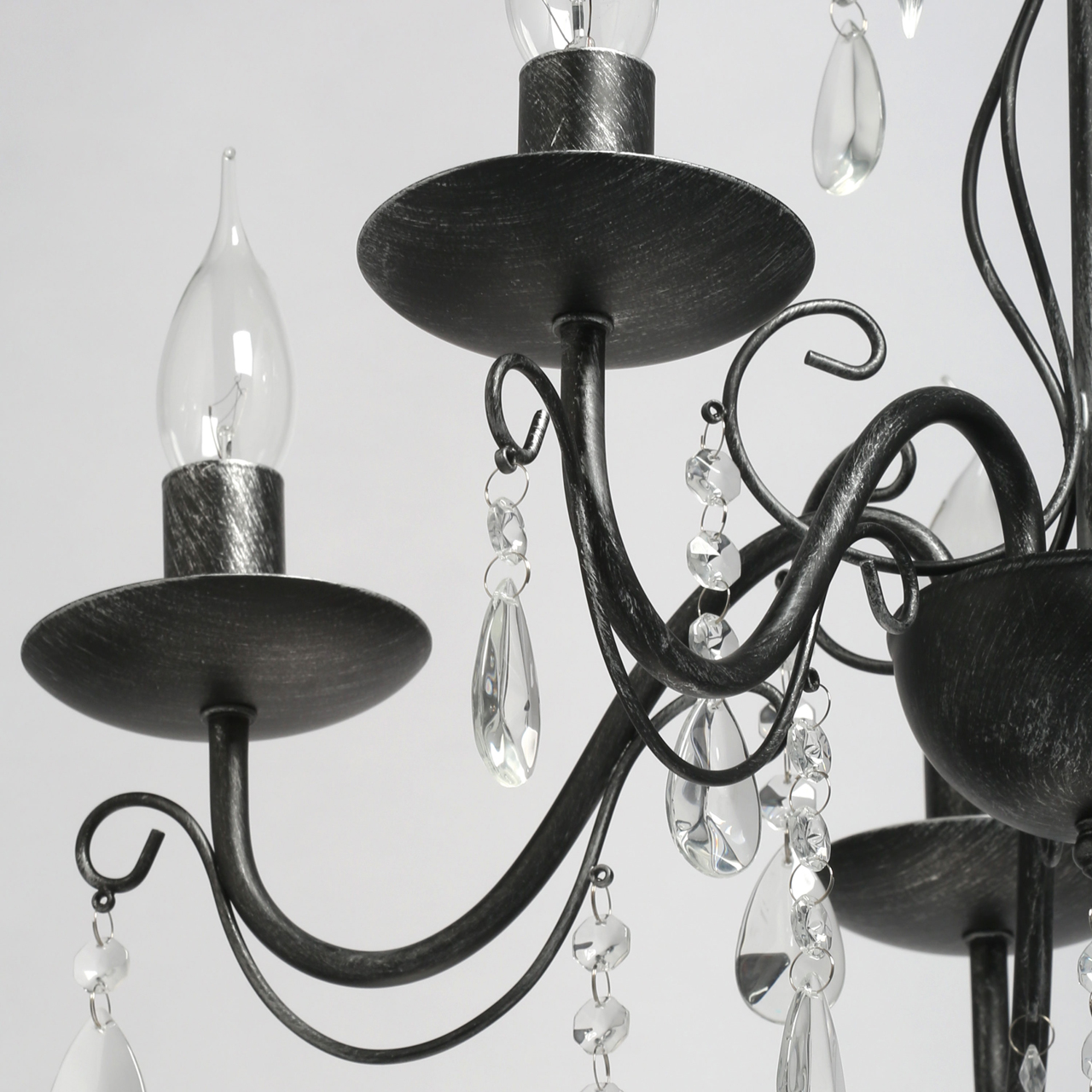 Основание светильника выполнено из металла и обработано по технологии хай-лайт, где основной слой черного цвета, а декоративный слой серебряного цвета. Светильник декорирован прозрачным хрусталем.