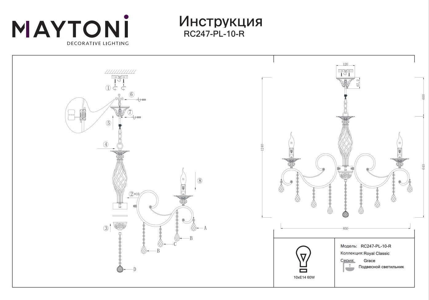 Подвесная люстра Maytoni Grace RC247-PL-10-R отлично подойдёт для гостиной, спальни, кабинета, столовой, оформленных в стиле прованс или классическом стиле, и украсит ваше интерьерное пространство.
