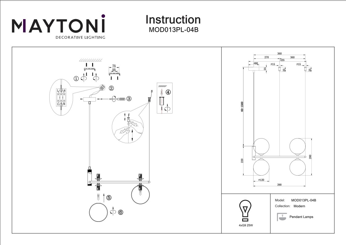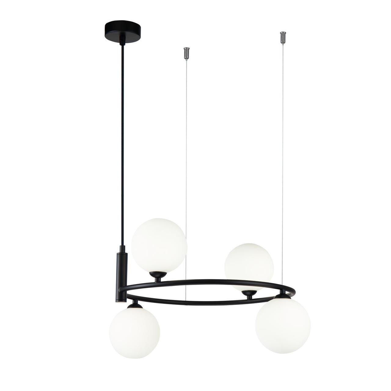 Подвесная люстра Maytoni Ring MOD013PL-04B, входящая в коллекцию Modern, отлично подойдет для освещения пространства в гостиной, на кухне, на даче, в кабинете, в баре, кафе и ресторане, оформленных в современном стиле или в стиле Хай-тек. Данный артикул имеет четыре плафона белого цвета в форме шара, выполненных из стекла и направленных вниз и вверх, а также матовую черную арматуру, изготовленную из металла. Немецкий производитель Maytoni дает гарантию на свое изделие 2 года и рекомендует использовать для устройства энергосберегающие лампы с цоколем G9 по 25 Вт каждая лампа и общей мощностью 100 Вт, что позволяет осветить помещение площадью 5,6 кв. м. Технической особенностью этого осветительного прибора является возможность регулирования по высоте, при этом максимальная высота люстры составляет 184 см. Способ крепления светильника к потолку на планку позволяет быстро и просто осуществить монтаж, при этом подходит для всех типов потолков, в том числе и натяжных. Стильный дизайн, тип подвеса на тросиках и матовая поверхность подвесной люстры Maytoni Ring MOD013PL-04B делают ее особенным элементом декора, который украсит любое интерьерное пространство.