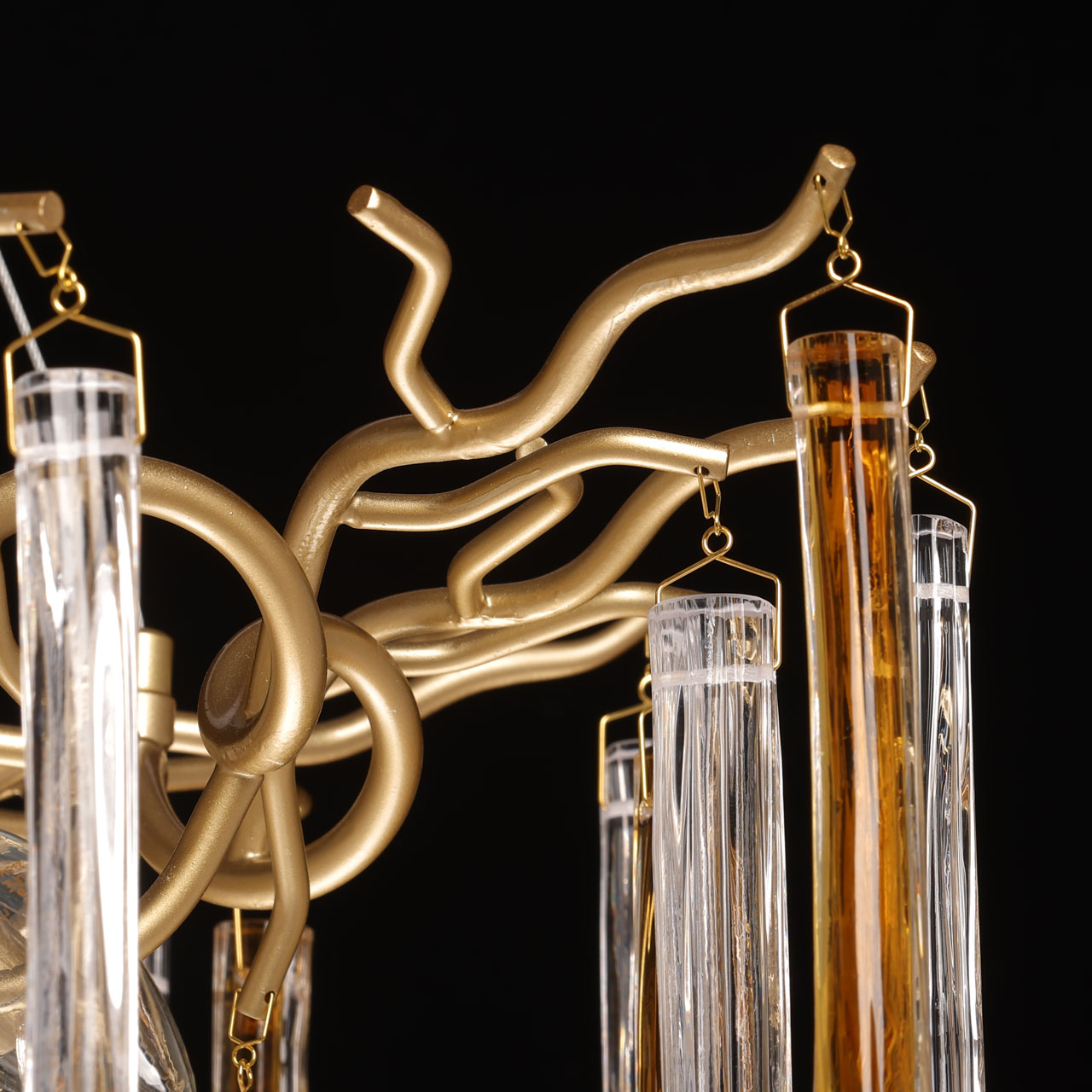 Металлическое основание подвесной люстры окрашено в цвет перламутрового золота. Люстра декорирована прозрачными стеклянными подвесками и подвесками, окрашенными в цвет карамели.