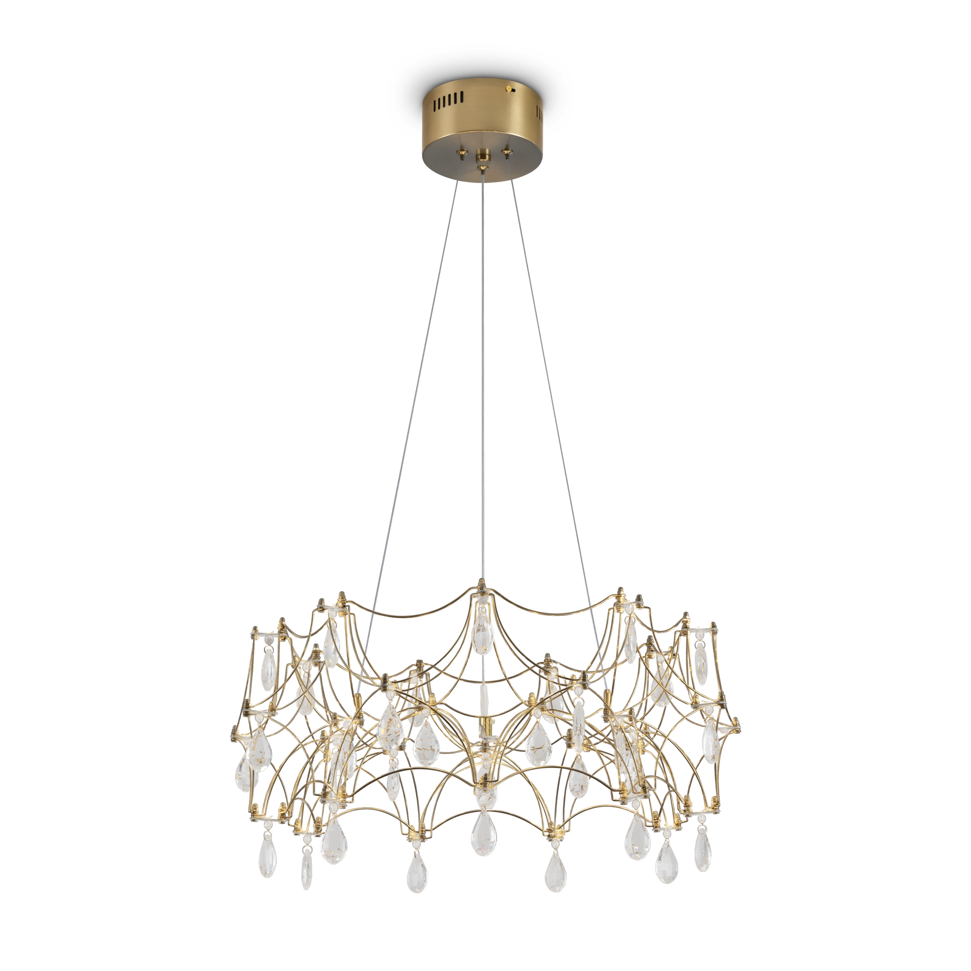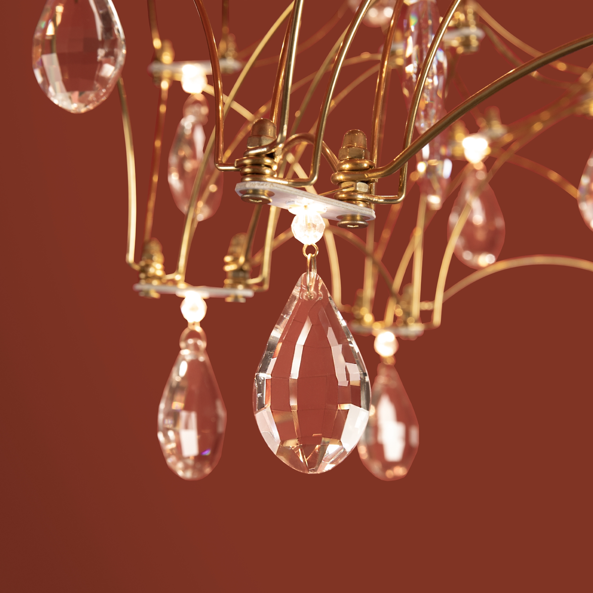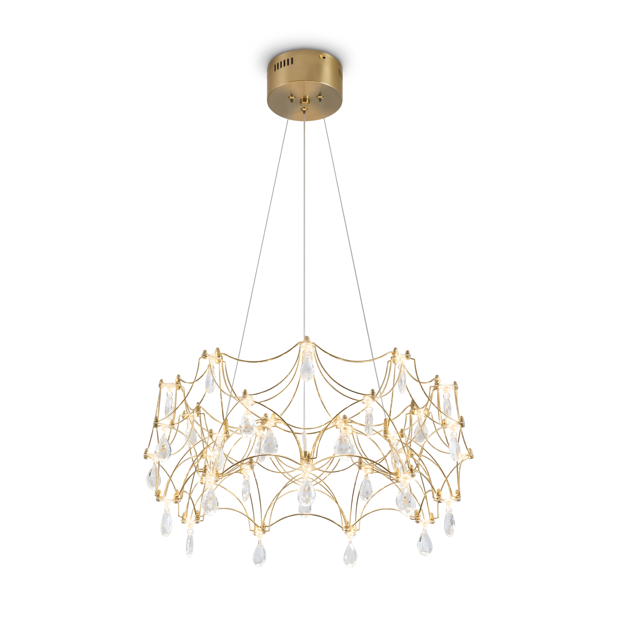 Воздушная конструкция с хрустальными капельками. Металл искусно изогнут и переплетен, образуя причудливый узор. Внутри этой металлической паутины расположены миниатюрные LED источники.