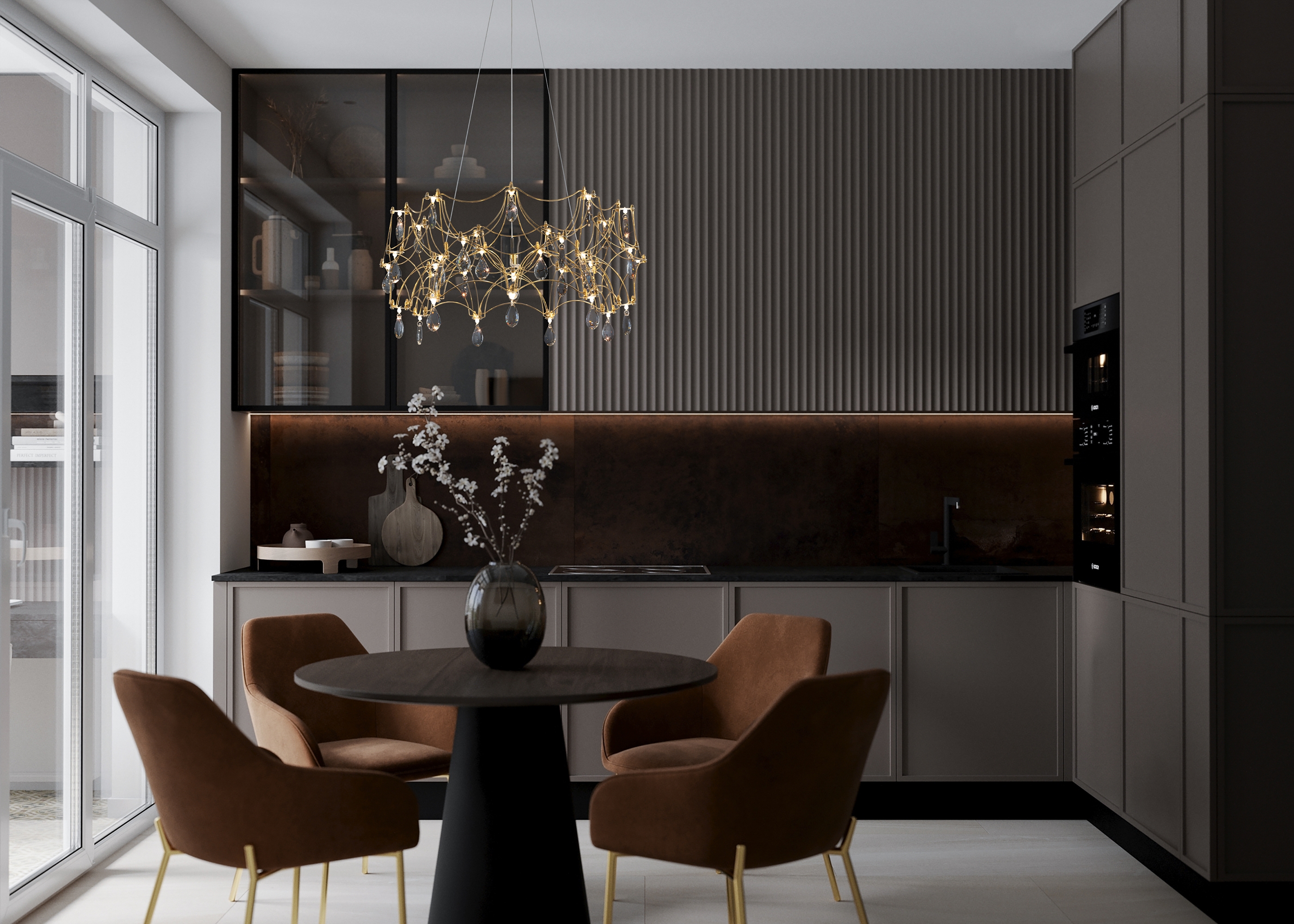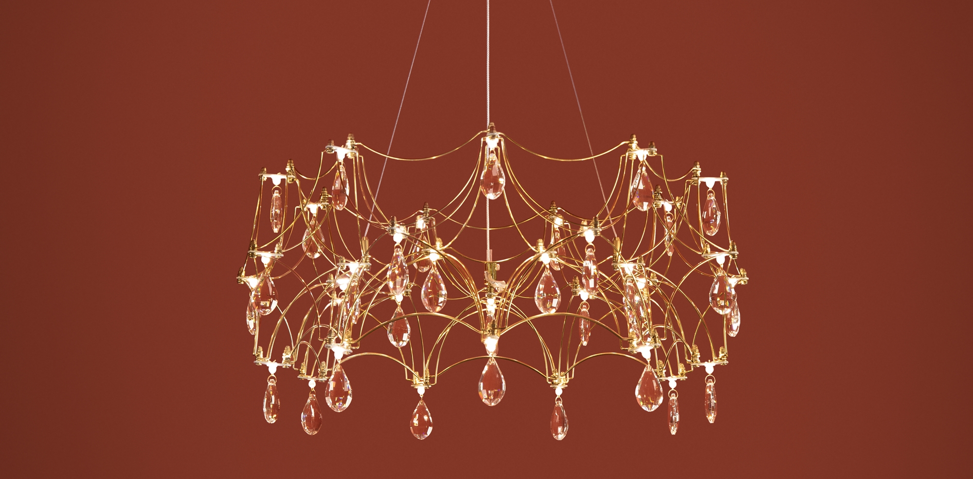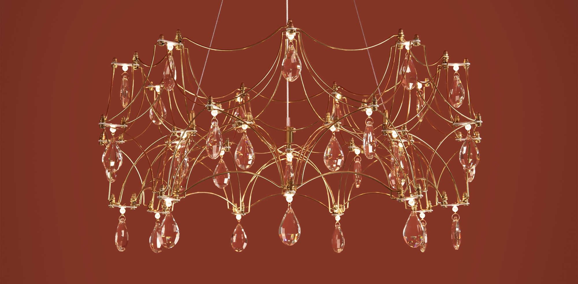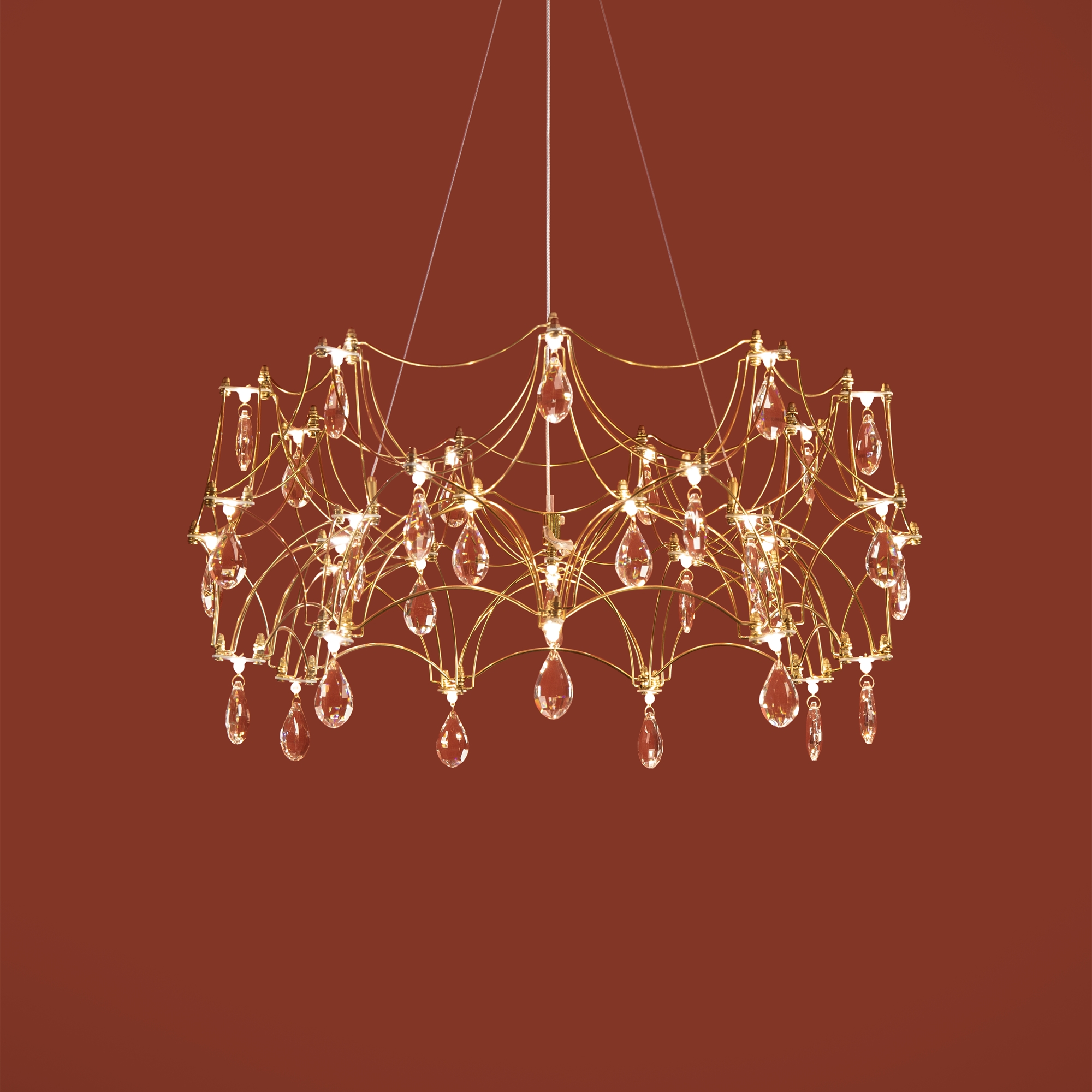 Воздушная конструкция с хрустальными капельками. Металл искусно изогнут и переплетен, образуя причудливый узор. Внутри этой металлической паутины расположены миниатюрные LED источники.