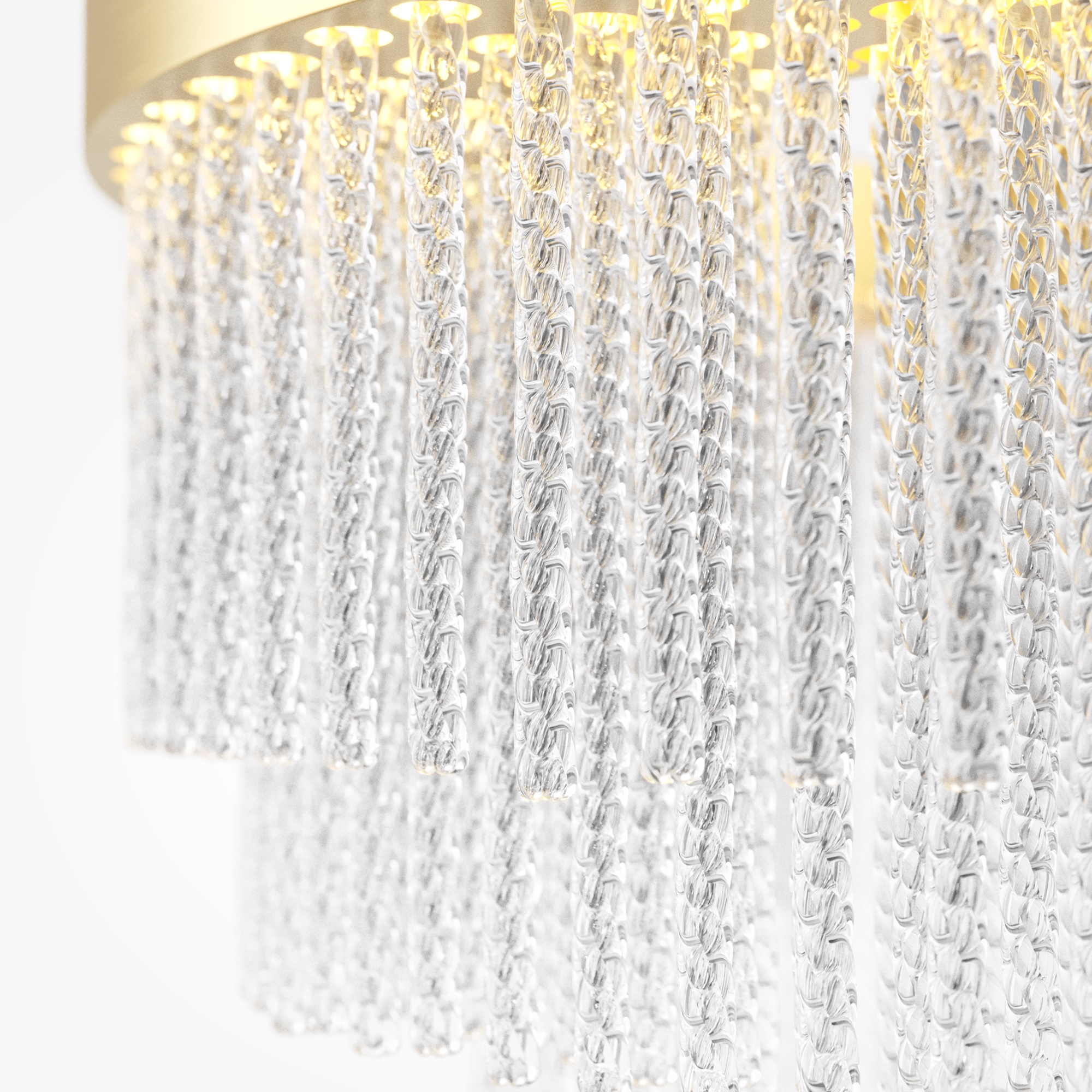 Арматура выполнена из металла в цвете латуни с легким мерцающим финишем. Декоративные элементы: стеклянные трубочки с витиеватым орнаментом, игриво переотражающим свет. Встроенный LED-источник, создающий свет достаточный для основного освещения. Трехступенчатый переключатель позволяет выбирать цветовую температуру: 2700K, 3000K или 4000K. Высота светильника регулируется, максимальная высота - 3300 мм. Высокий индекс цветопередачи CRI >90. Создает изысканное освещение с игрой бликов и переотражений.