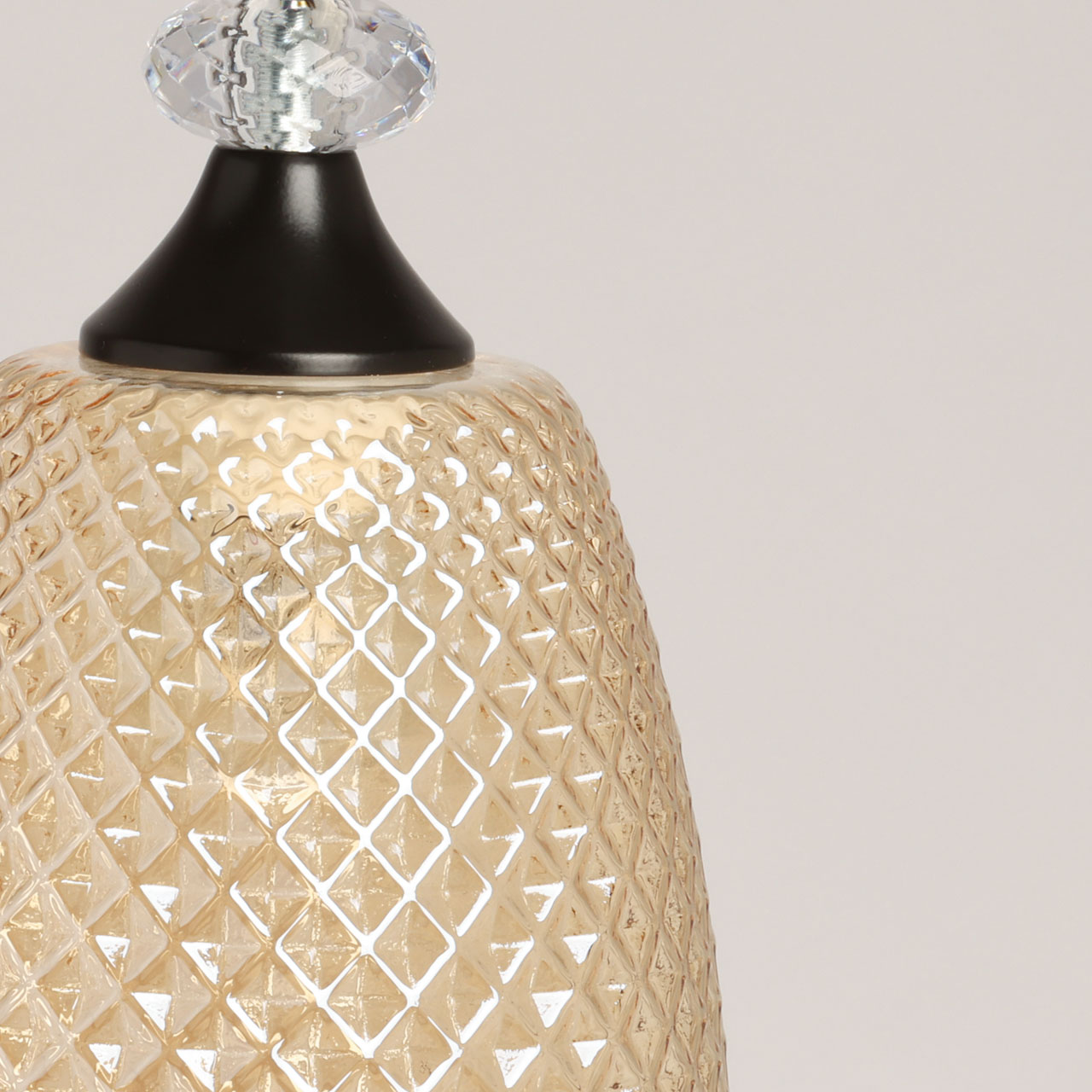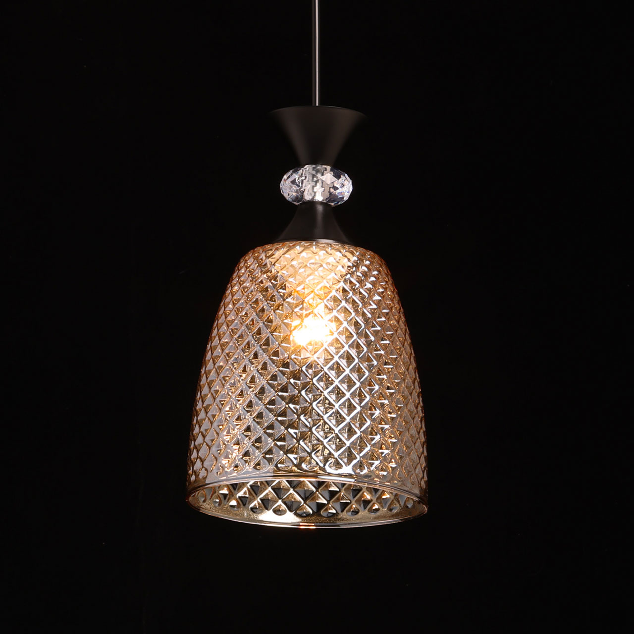 Металлическое основание окрашено в черный цвет. Традиционный источник света закрыт стеклянным фактурным плафоном, гальванизированным в цвет янтаря. Подвес декорирован прозрачным акрилом.