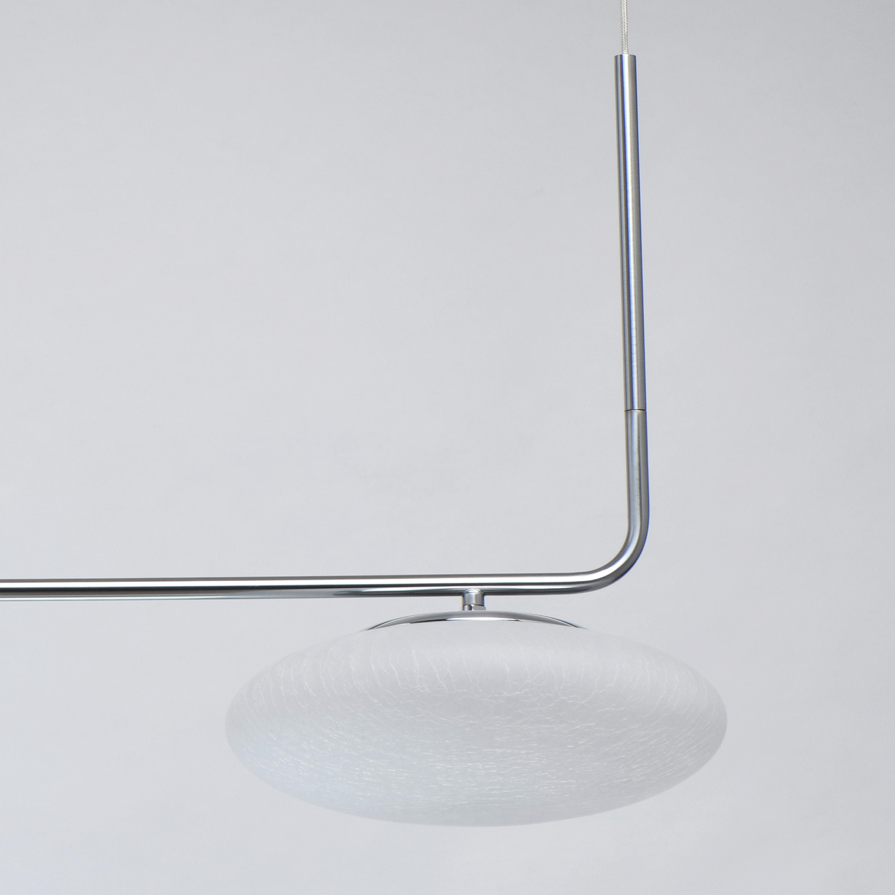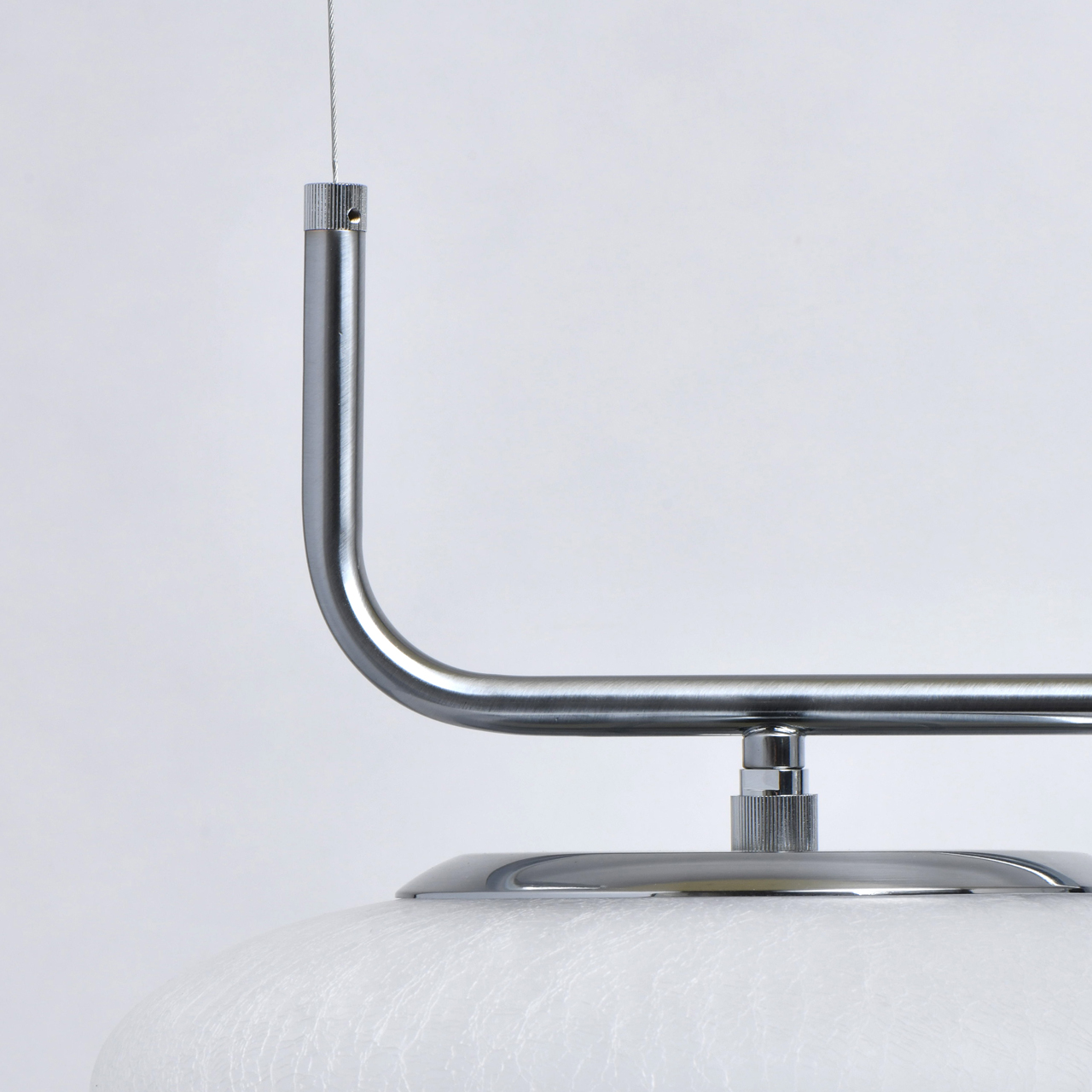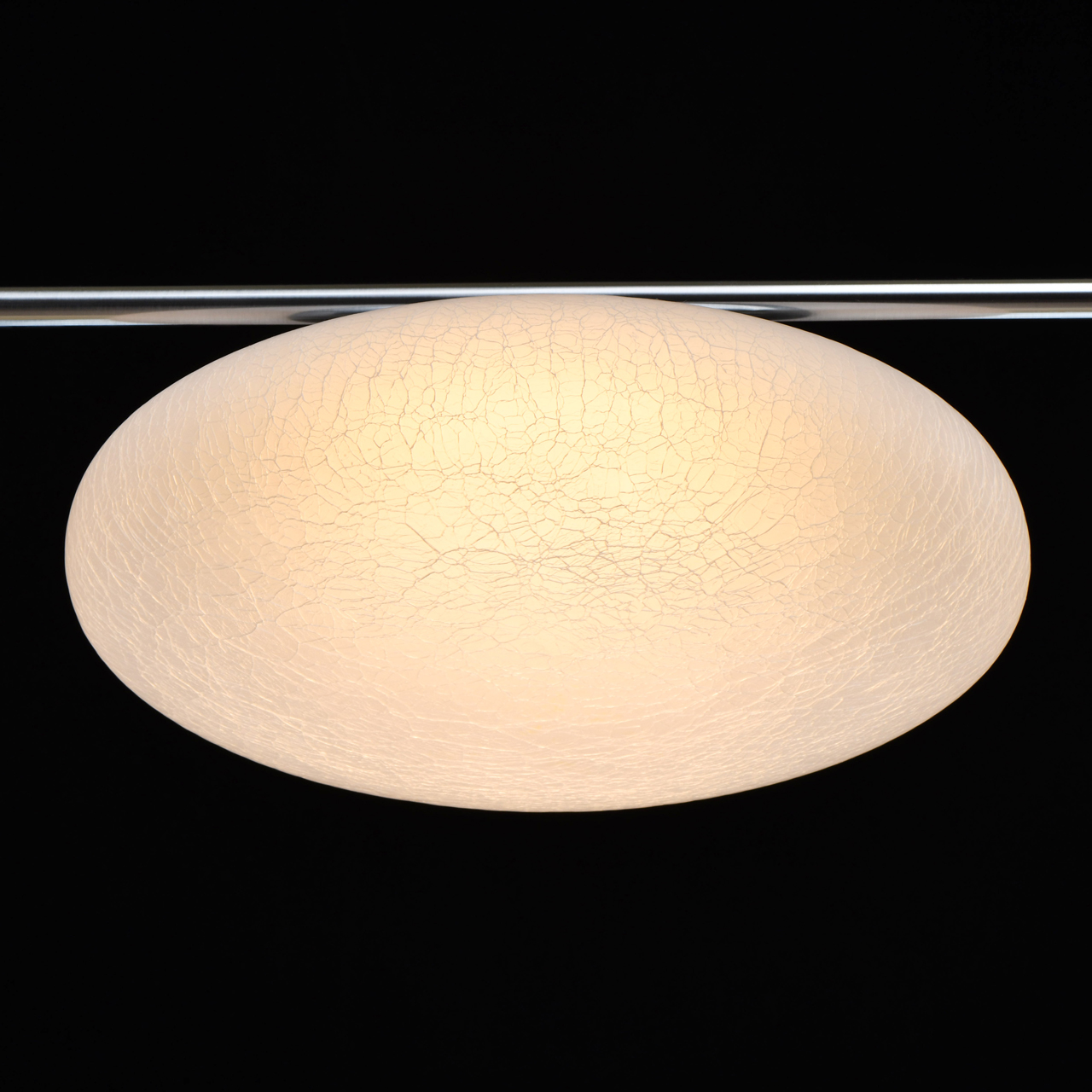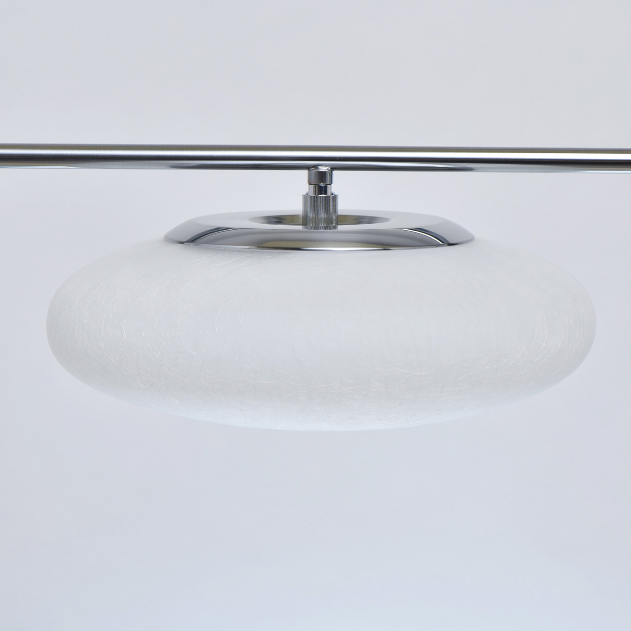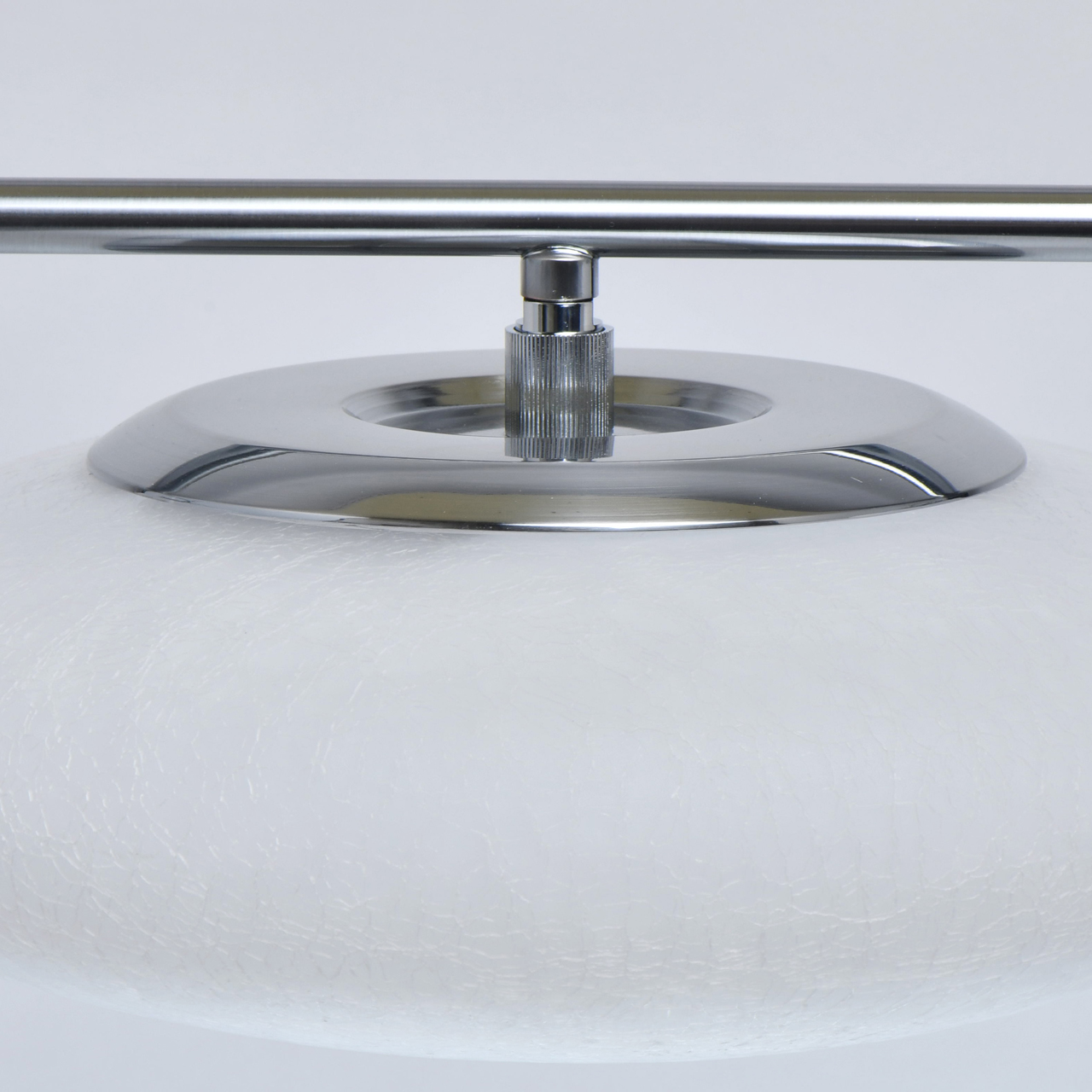 Основание светильника выполнено из металла и гальванизировано в цвет матового хрома. Плафоны выдуваются в форму и обработаны по технологии кракелирования и матирования.