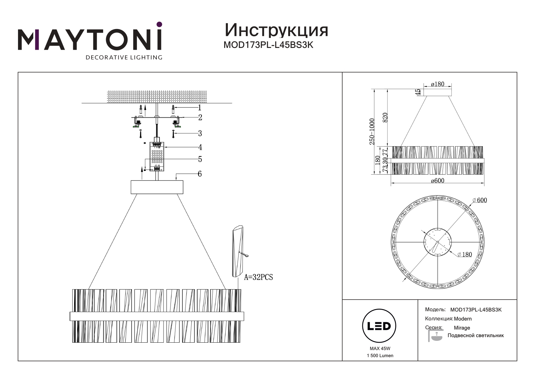 Данную модель MOD173PL-L45BS3K с быстрой доставкой спешите купить по цене 74 490 ₽ в магазине 220svet.ru