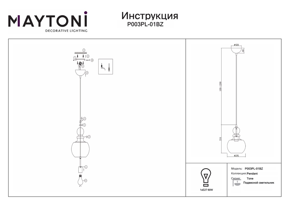 Подвесной светильник Maytoni Tone P003PL-01BZ в новосибирске