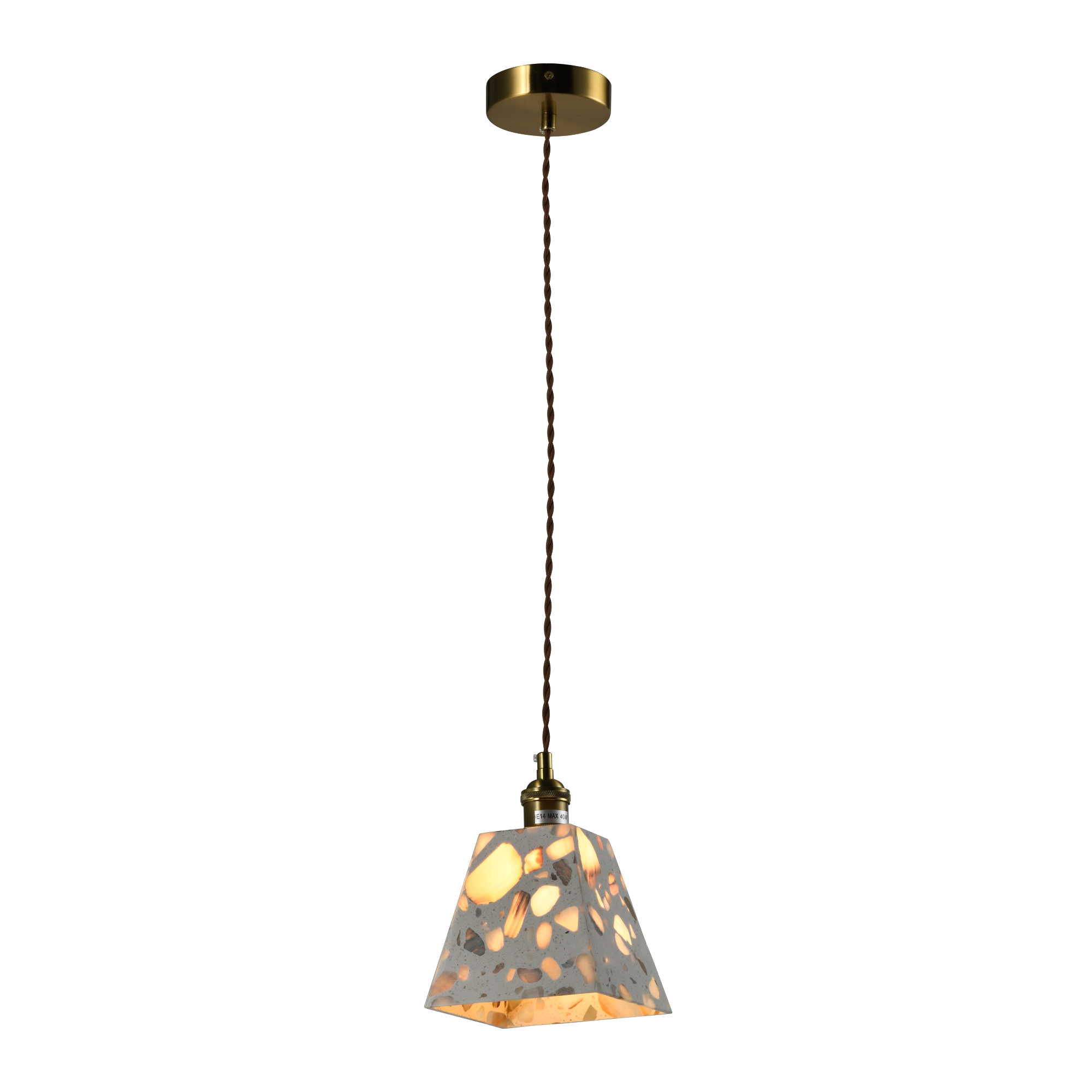 Подвесной светильник исполнен в таких стилях как: Скандинавский, минимализм, хай-тек . Также Подвесной светильник может использоваться для натяжного потолка. Она освещает комнату до 6кв.м. Подходит в такие комнаты как: Спальня, Кухня, Детская, Холл, Коридор, Столовая, Лоджия, Мансарда ,Гардеробная, Кладовая, Веранда, Санузел. Подвесной светильник изготовлен из таких материалов как: Терраццо, сталь. При окраске наших изделий используется порошковая краска, которая не имеет запаха так как технологи окраски осуществляются в печах для запекания при высокой температуре. Все элементы металлического цвета окрашиваются гальваническим способом и покрываются защитным слоем прозрачного лака.