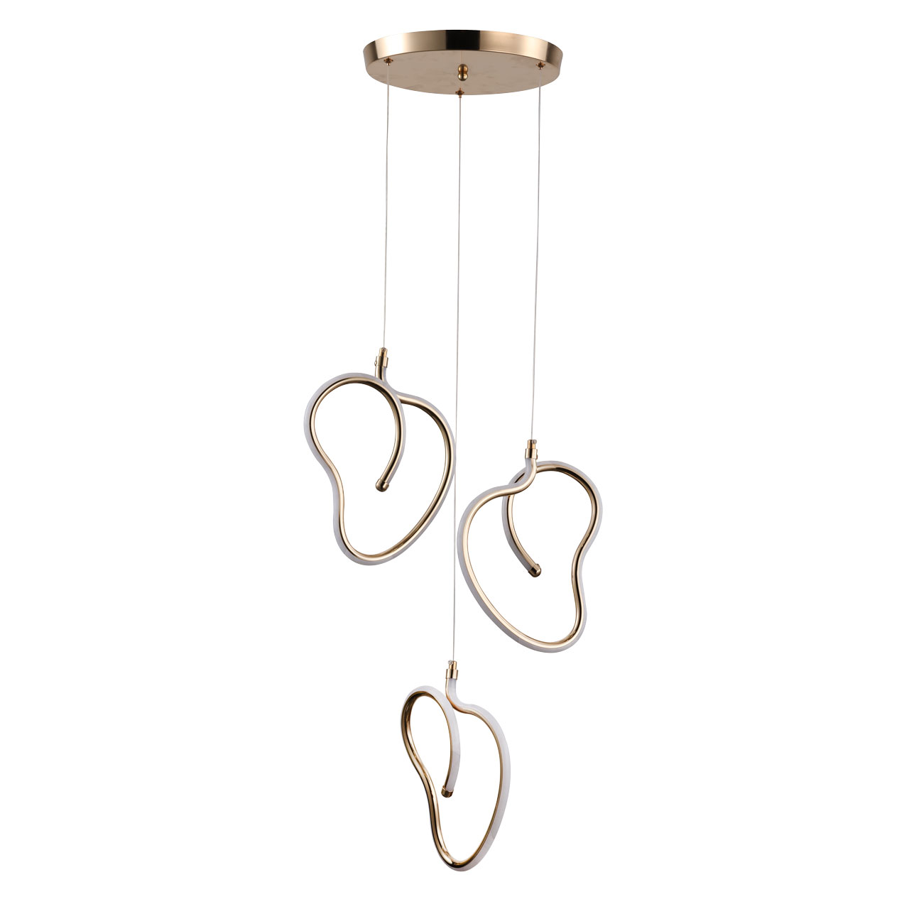 Металлическое основание подвесной люстры гальванизировано в цвет французского золота. Корпус плафонов выполнен из акрила и гальванизирован в цвет основания. Светодиодные источники света закрыты белым матовым силиконом.