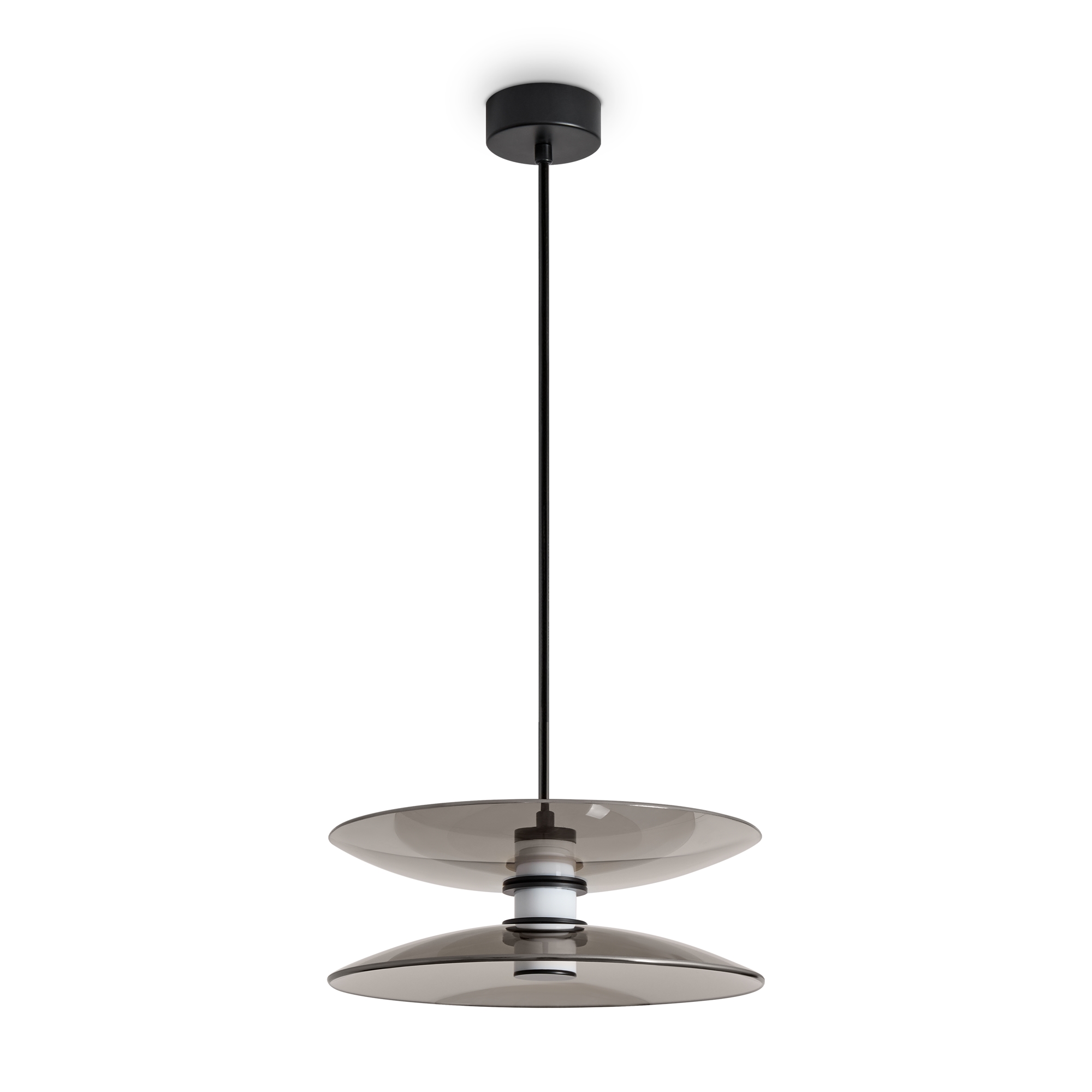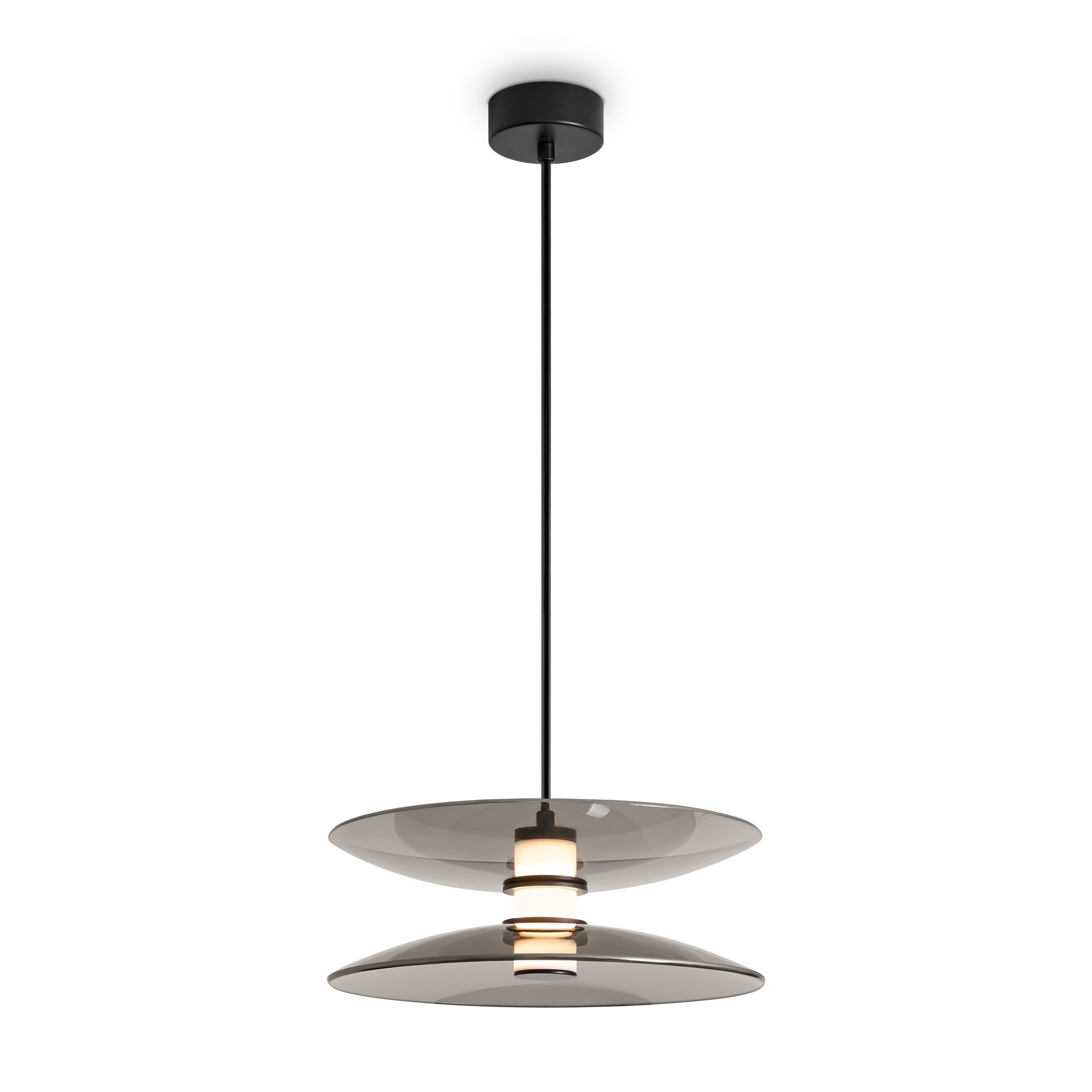 Материал арматуры — металл, цвет — черный. Плафоны выполнены из стекла дымчатого цвета. Светильники представлены в подвесном и напольном исполнении и оснащены LED-источником света с цветовой температурой 3000К. Сочетание металла и затемненного стекла создает выразительную атмосферу в современных интерьерах таких как минимализм и лофт.