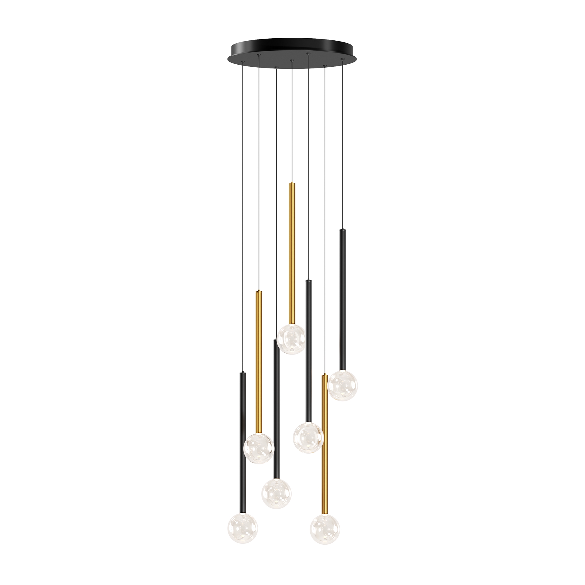 Цвет арматуры — черный, латунь, комбинация черный и латунь. Материал арматуры — металл. Цветовая температура 3000К. Оригинальный «невесомый» дизайн с тонкими металлическими трубками и стеклянными шарами-плафонами. LED-источники света. Регулируемая длина провода подвесных светильников, 3 метра, подходит для помещений с высокими потолками. Каскадная композиция на 7 и 15 плафонов оснащена проводом длиной 3,5 метра для эффектных дизайнерских решений. Подходит для высоких потолков. Парящие модели для создания легкой, воздушной атмосферы в интерьере.