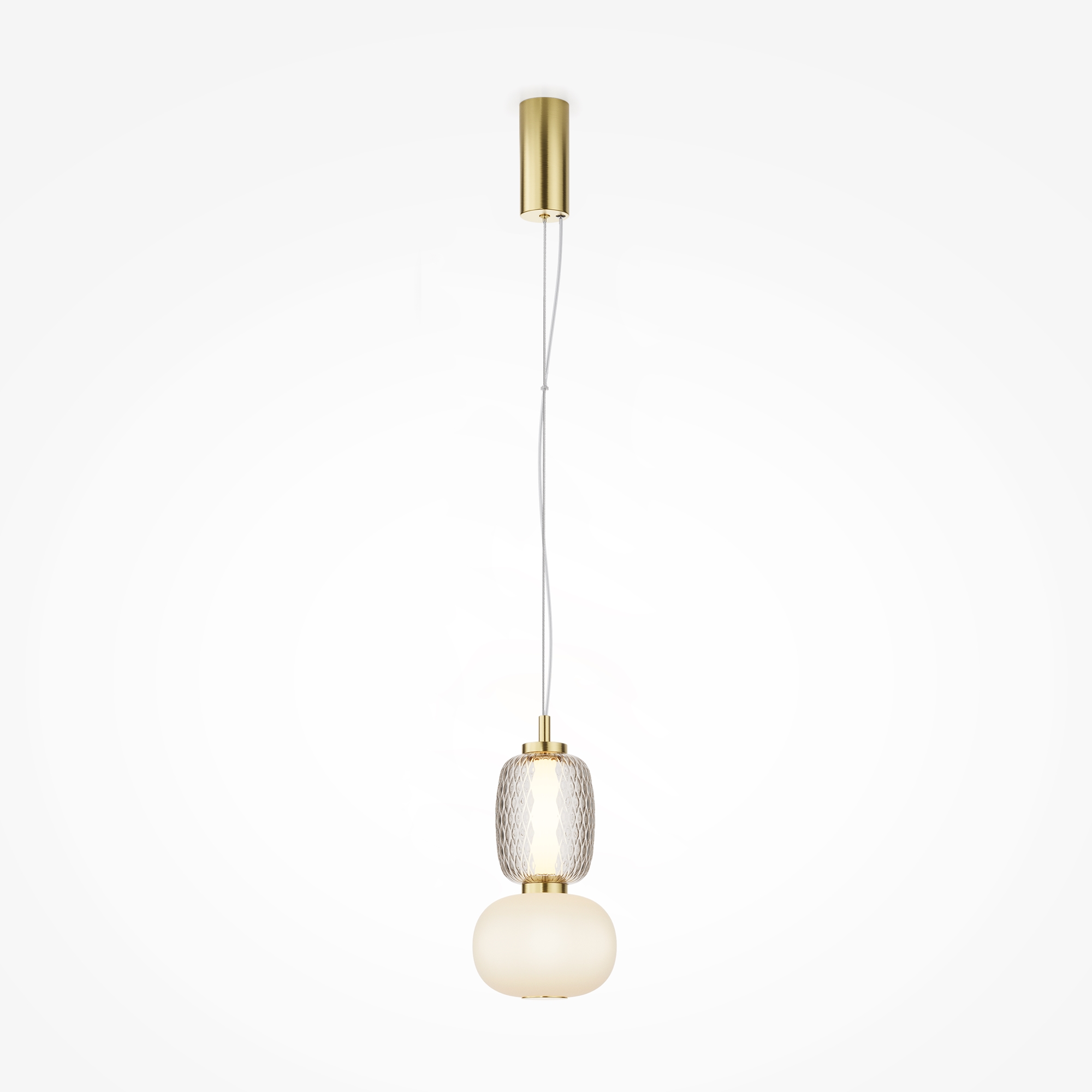 Металлическая арматура, цвет - золото, хром. Микс плафонов округлых и вытянутых форм из белого матового и прозрачного стекла с сетчатым и с линейным повторяющимся рельефным рисунком. Регулируемая высота подвесных моделей, провод - 3 метра. LED-источник света, цветовая температура 3000К.