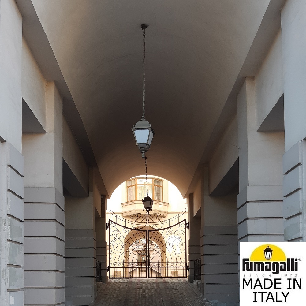 Подвесной уличный светильник FUMAGALLI большого размера серии SIMON, модель SICHEM/SIMON. Фонарь большого размера на цепочке-подвесе SICHEM применяется для освещения открытого уличного пространства арок, навесов, галерей и других архитектурных элементов. Цепочка светильника регулируется по длине. Изготовлены в Италии, по уникальным технологиям "FUMATECH" из современного композитного полимера RESIN. Этот материал в 5 раз прочнее металла, не ржавеет, не окисляется, не выгорает на солнце, его не нужно красить. Все светильники пыле-влаго защищены по стандарту IP55 (Пылезащищенные, защита от водяных струй с любого направления). Рассеиватель выполнен из антивандального, не мутнеющего и не горючего PMMA (ПолиМетилМетаАкрилат). Срок службы светильника - не менее 20 лет. Температура использования от -60 до +90. В серии SIMON есть садовые фонари в настенном (OFIR/SIMON, MIRRA/SIMON) подвесном (SICHEM/SIMON) и наземном исполнении (IAFAET.R/SIMON, ALOE.R/SIMON, ARTU/SIMON, GIGI/SIMON, RICU/SIMON, NEBO/OFIR/SIMON 1L, NEBO/OFIR/SIMON 2L, TABOR/ADAM/SIMON 3L) со столбами разной высоты, с разным количеством и конфигурацией голов. Консоли настенных фонарей и кронштейны светильников на столбах освещения могут устанавливаться в положение вверх и вниз. Столбы выше 150 см имеют в основе мощную стальную трубу с двойной оцинковкой. При заказе требуется выбрать цвет корпуса, цвет плафона и тип патрона (Е-27 или LED GX-53). Возможен светодиодный вариант. По стилю и дизайну серия уличных светильников SIMON похожа на светильники среднего размера серии CEFA. По размеру относится к большим парковым светильникам как серия NOEMI и GLOBE 400.