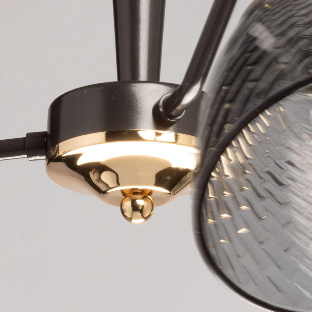 Основание светильника выполнено из металла и окрашено в цвет кофе. Отдельные элементы основания гальванизированы в цвет золота. Стеклянные плафоны отлиты в сложную форму с внутренней текстурой и гальванизированы в дымчатый цвет.
