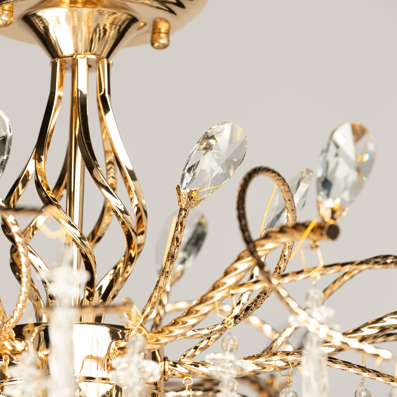 Металлическое основание светильника гальванизировано в цвет золота. Потолочная люстра декорирована прозрачным хрусталем различной формы.