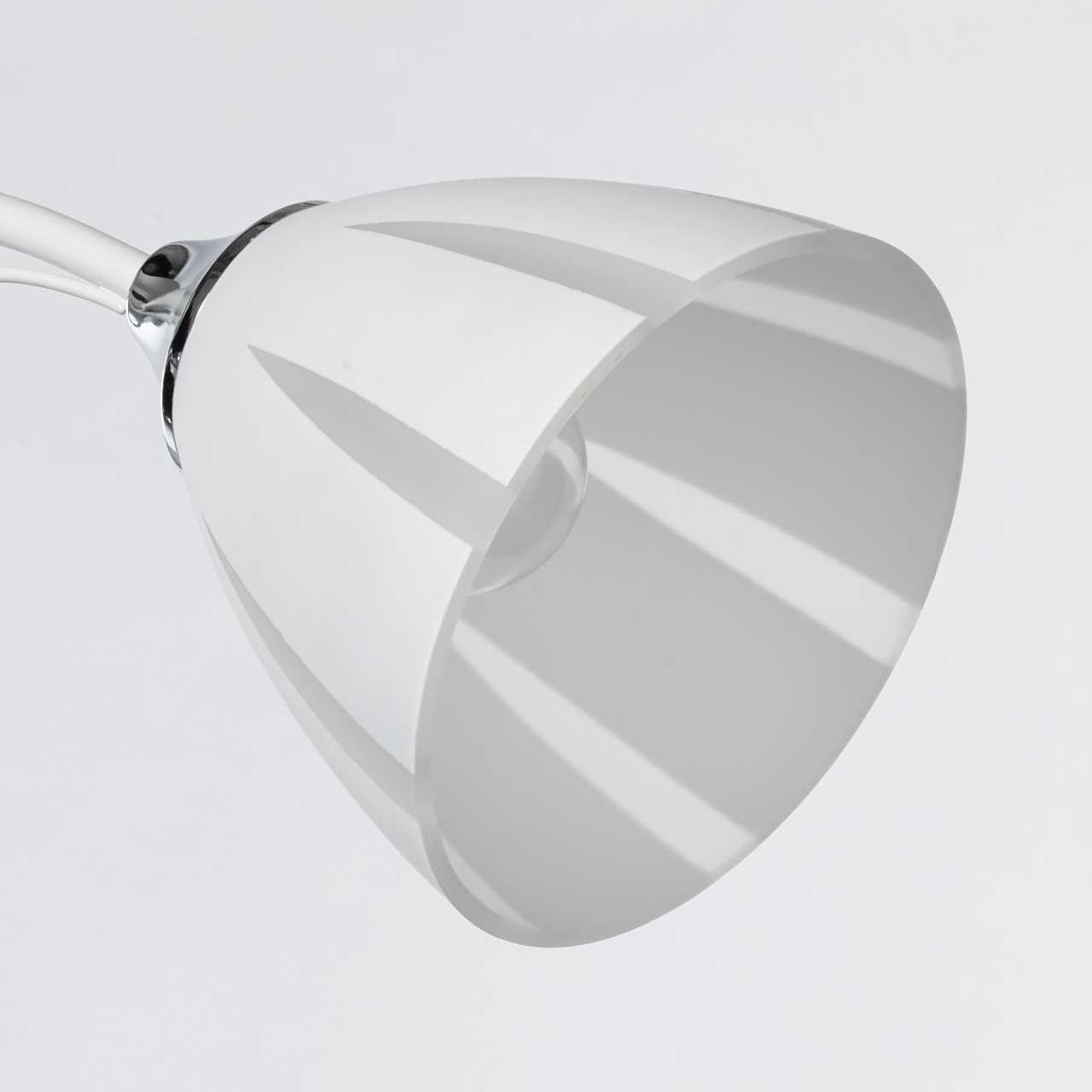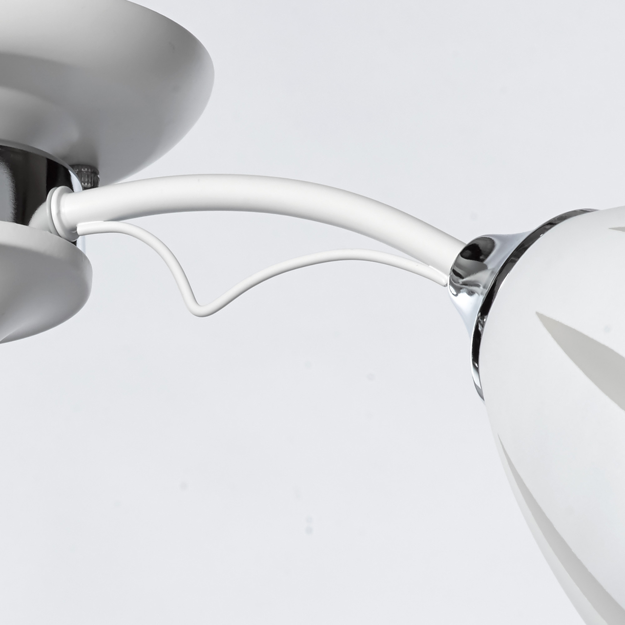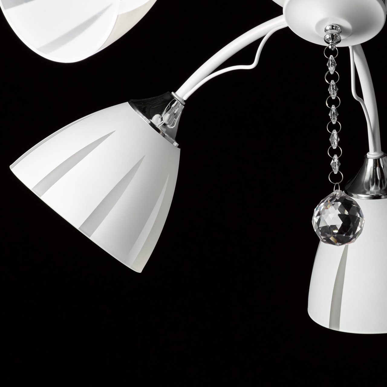 Металлическое основание окрашено в белый, как и изогнутые рожки. Держатели плафонов хромированы, контраст выглядит свежо и органично. Стеклянные плафоны матированы и покрыты белой краской по трафарету. Оригинальный рисунок создает иллюзию сложной формы и объема. Дополнительным декором служит крупный хрустальный шар, завершающий композицию.