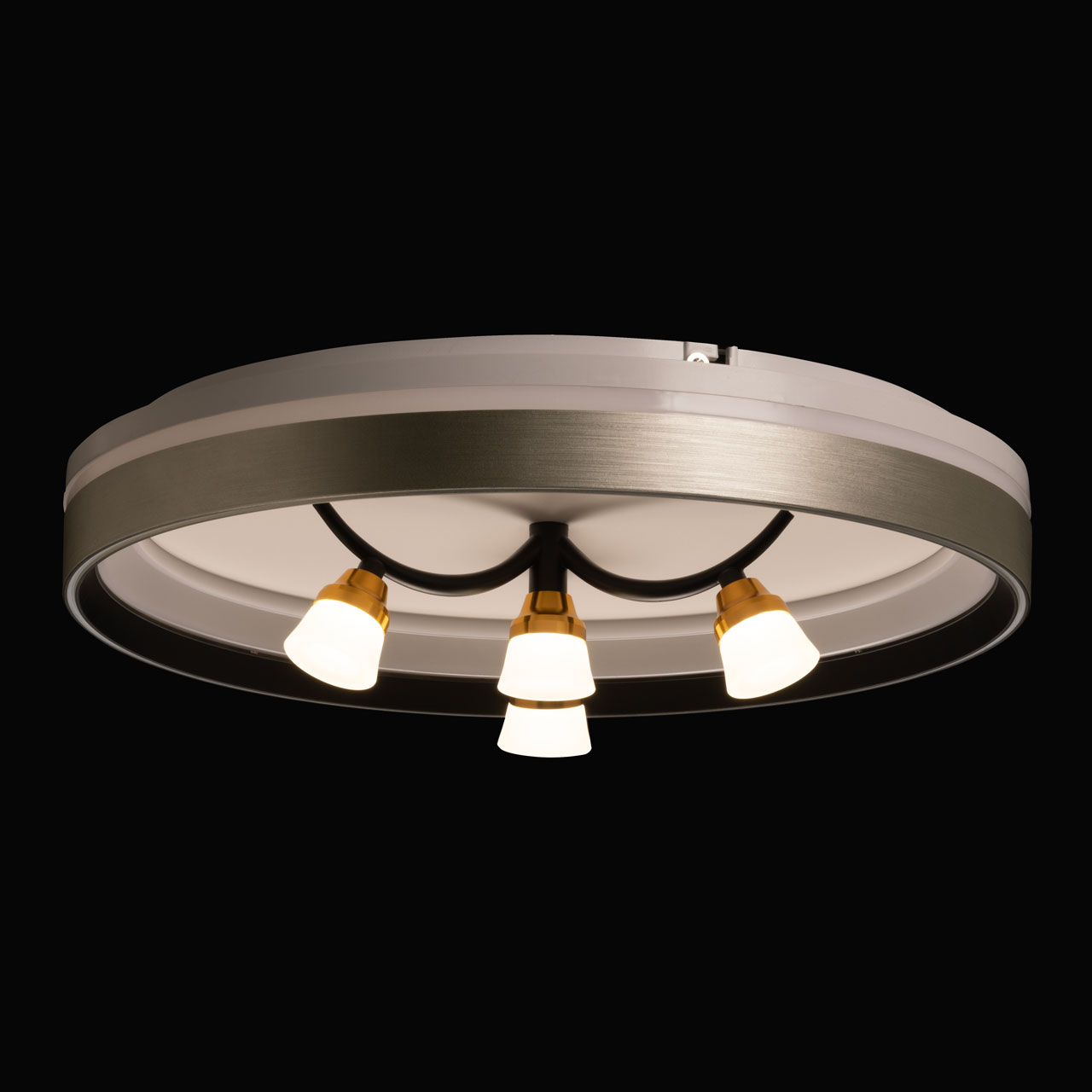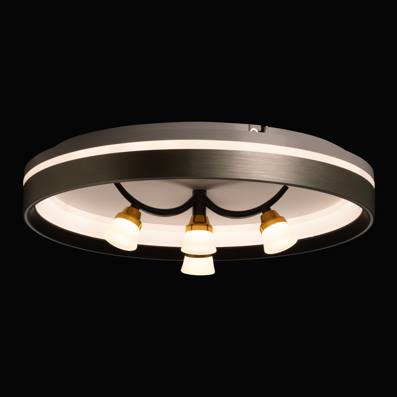 Металлическое основание потолочной люстры окрашено в белый цвет. Корпус плафона выполнен из сплава алюминия и окрашен с наружи в серый цвет, с внутренней стороны в черный цвет. Светодиодные источники света закрыты белым матовым акрилом. Рожки окрашены в черный цвет, держатели ламп гальванизированы в цвет золота.
