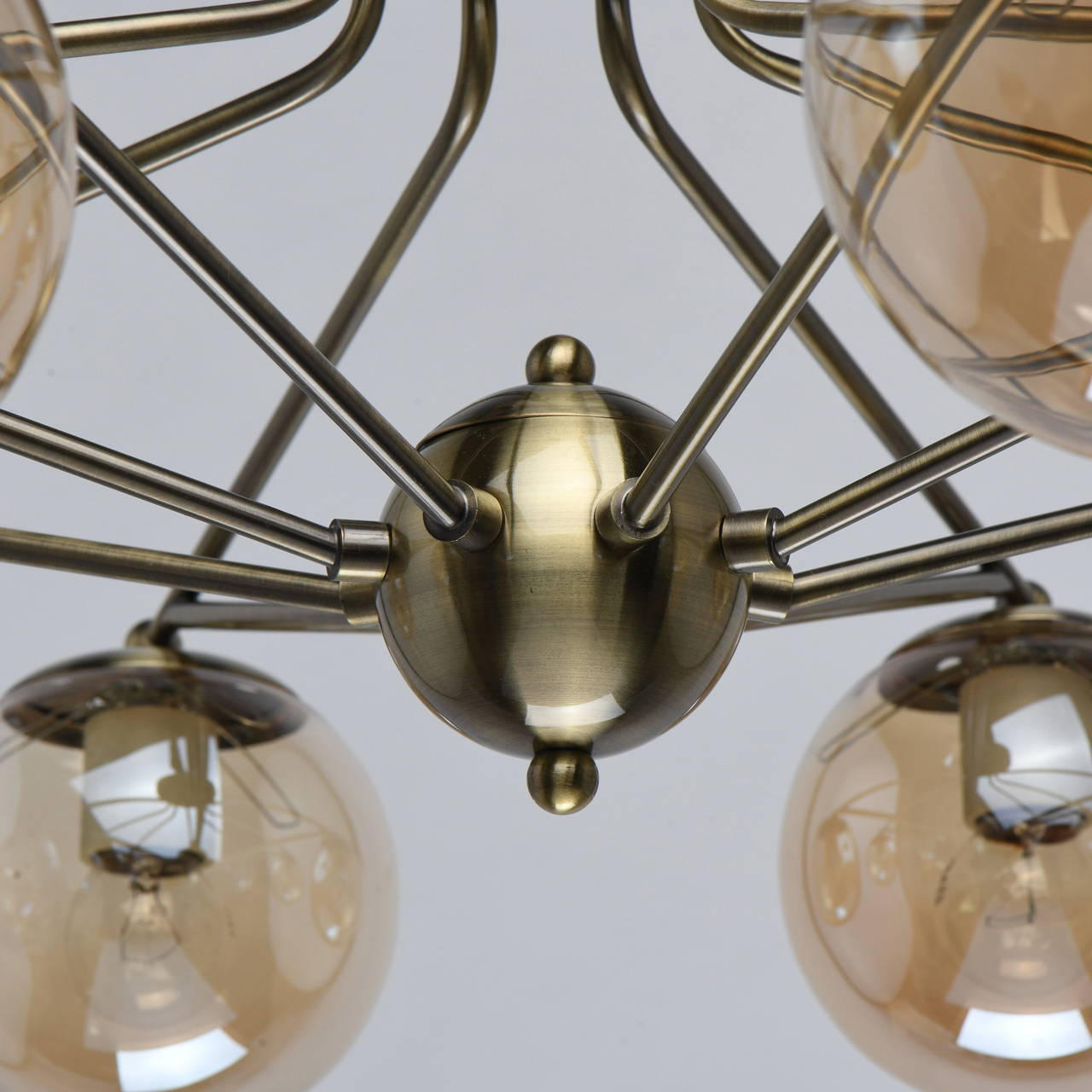Оригинальная потолочная люстра De City Оливия 306013608 сочетает в себе черты сразу нескольких стилевых решений. Лакированное и декорированное патиной основание цвета бронзы напоминает о стимпанке. Эстетику эпохи паровых машин усиливает сферическая центральная часть, выполняющая декоративную функцию. Прозрачные плафоны-сферы из стекла, тонированного в коньячный оттенок, создают индустриальный эффект. Это позволяет вписать люстру в современный интерьер с «промышленными» нотками, например, в стили лофт или фьюжн.