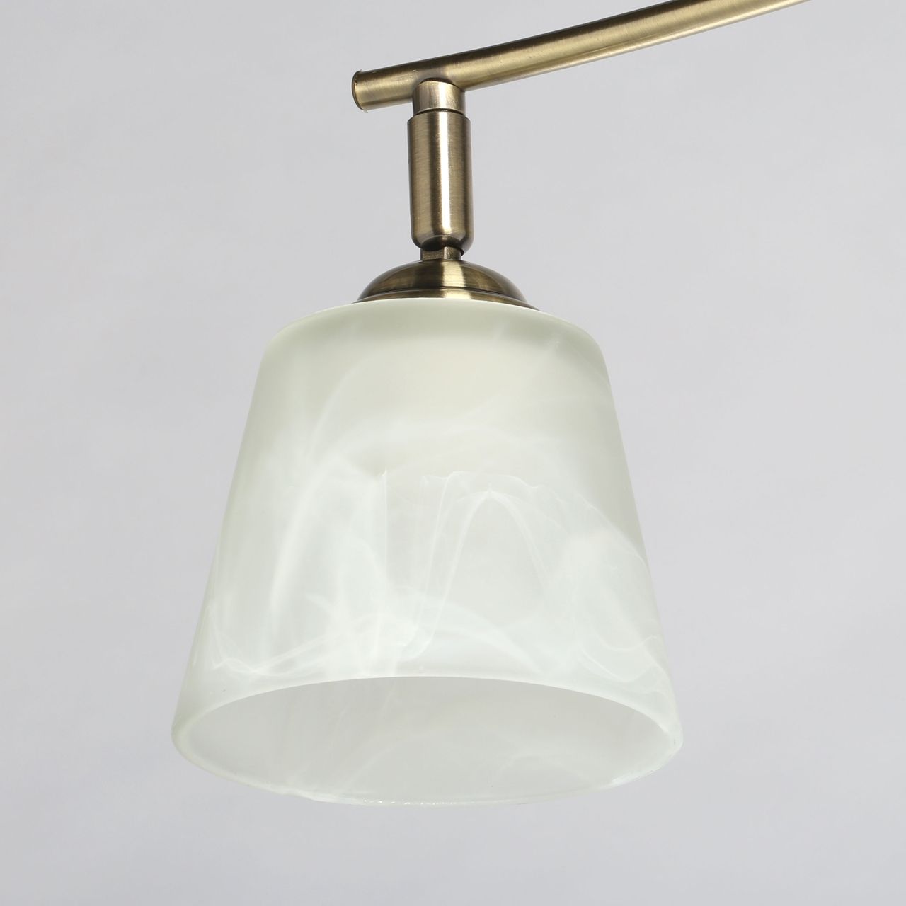 Основание светильника выполнено из металла и гальванизировано в цвет античной бронзы. Светильник декорирован плафонами, выполненными из алебастрового стекла.