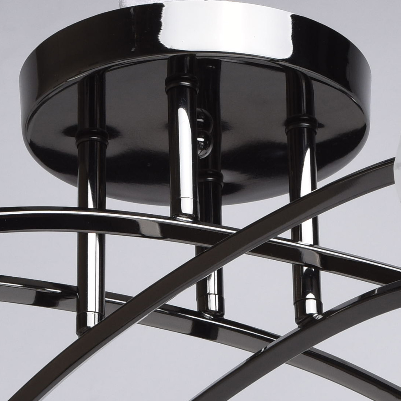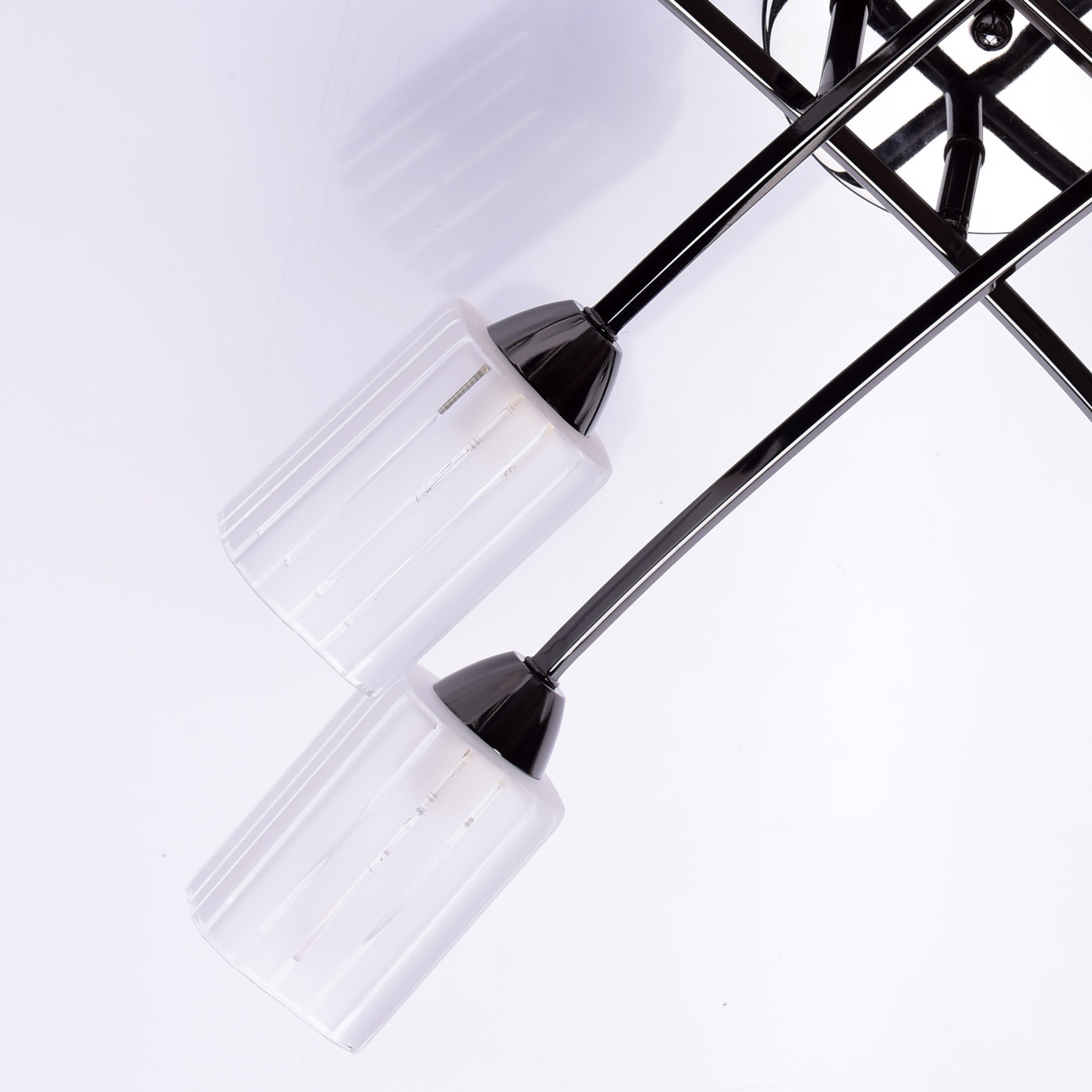 Основание светильника выполнено из металла и гальванизировано в цвет черного никеля. Потолочная чаша и держатели плафонов изготовлены по технологии обработки на токарном станке.Плафоны: стекло, отлито в форму. Плафоны матированы по трафарету.