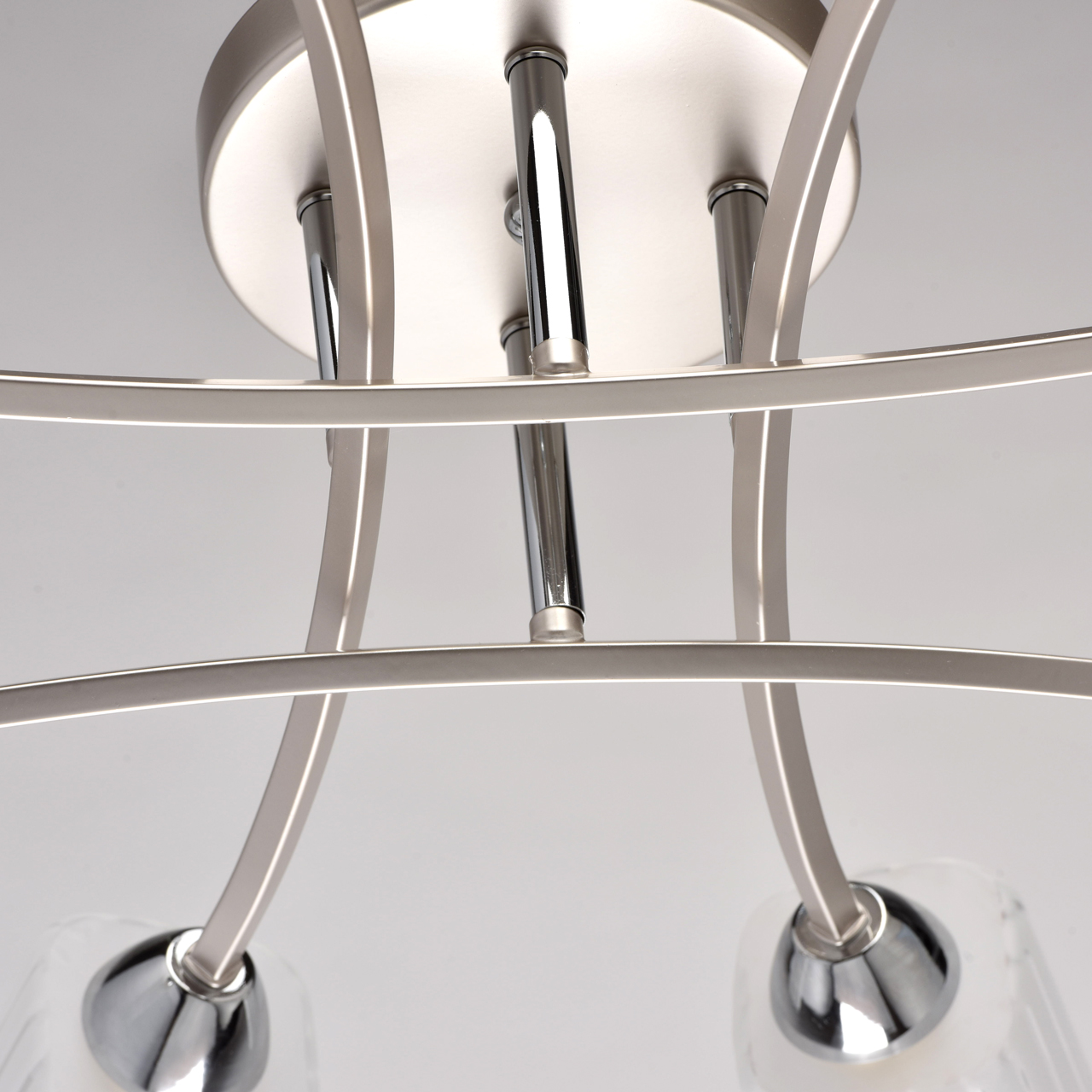 Минималистичная потолочная люстра De Markt Олимпия 638012308 органично подчеркнет интерьер любой комнаты, оформленной в стилях хай-тек, контемпорари или сканди. Модель отличает строгая форма основания, окрашенного в изящный оттенок перламутрового серебра. Его дополняют хромированные глянцевые элементы, служащие одновременно декором люстры. Стеклянные плафоны созданы в матовом белом цвете и дополнены прозрачными полосами. Эстетичное пересечение рожков основания создает стильный геометрический узор, служащий главным украшением модели.