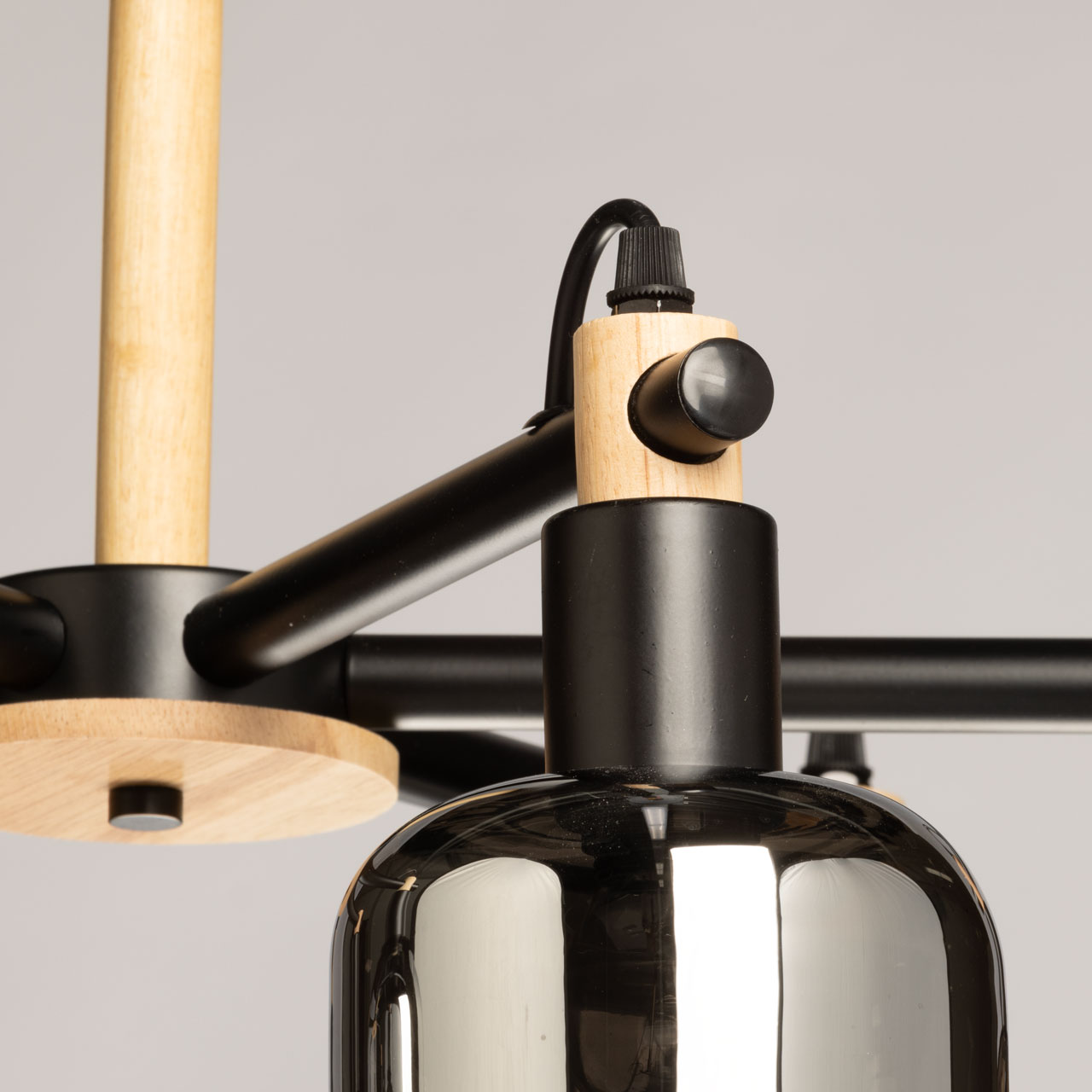 Металлическое основание потолочной люстры окрашено в черный цвет. Стеклянные плафоны отлиты в оригинальную форму и гальванизированы в дымчатый цвет. Потолочная люстра декорирована элементами из натурального светлого дерева.