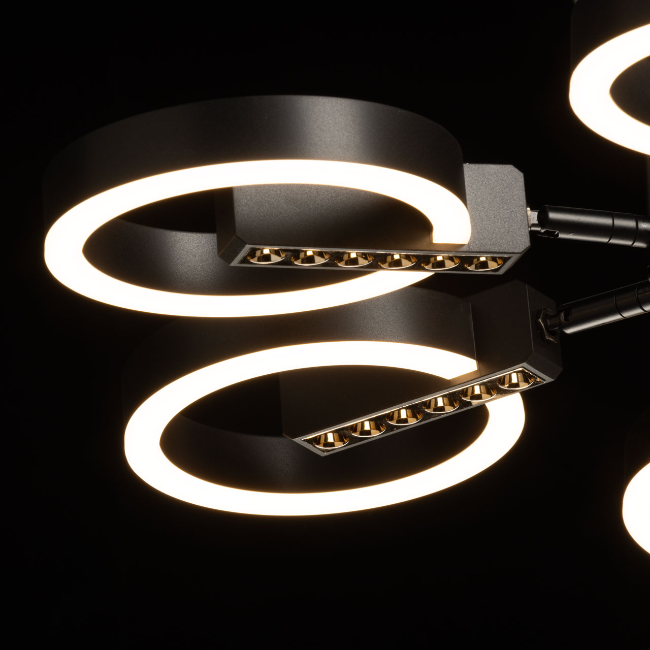 Металлическое основание подвесной люстры окрашено в черный цвет. Корпус плафонов выполнен из сплава алюминия и окрашен в цвет основания. Светодиодные источники декоративного света закрыты матовым акрилом. Открытые функциональные точечные светодиоды углублены в корпус плафонов.