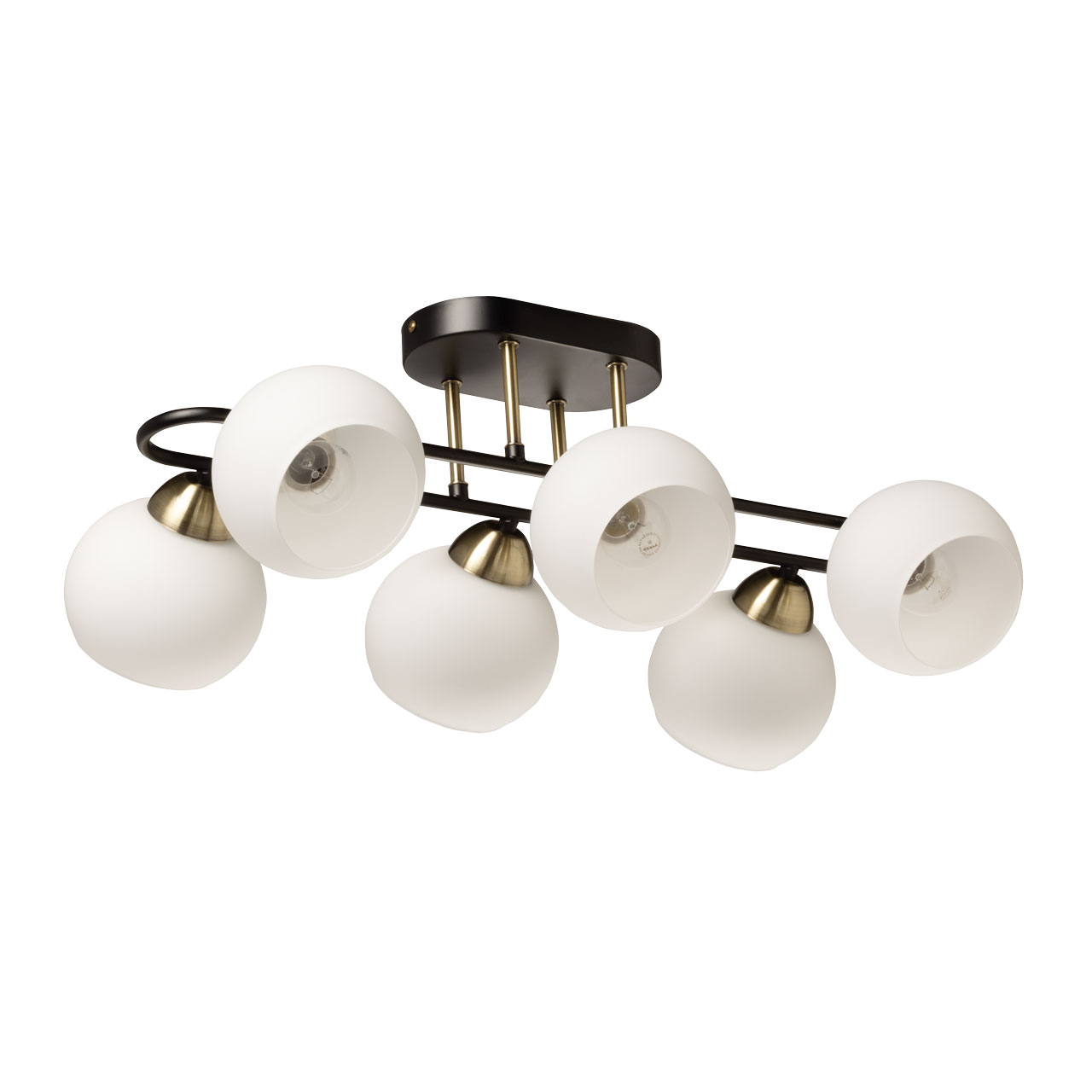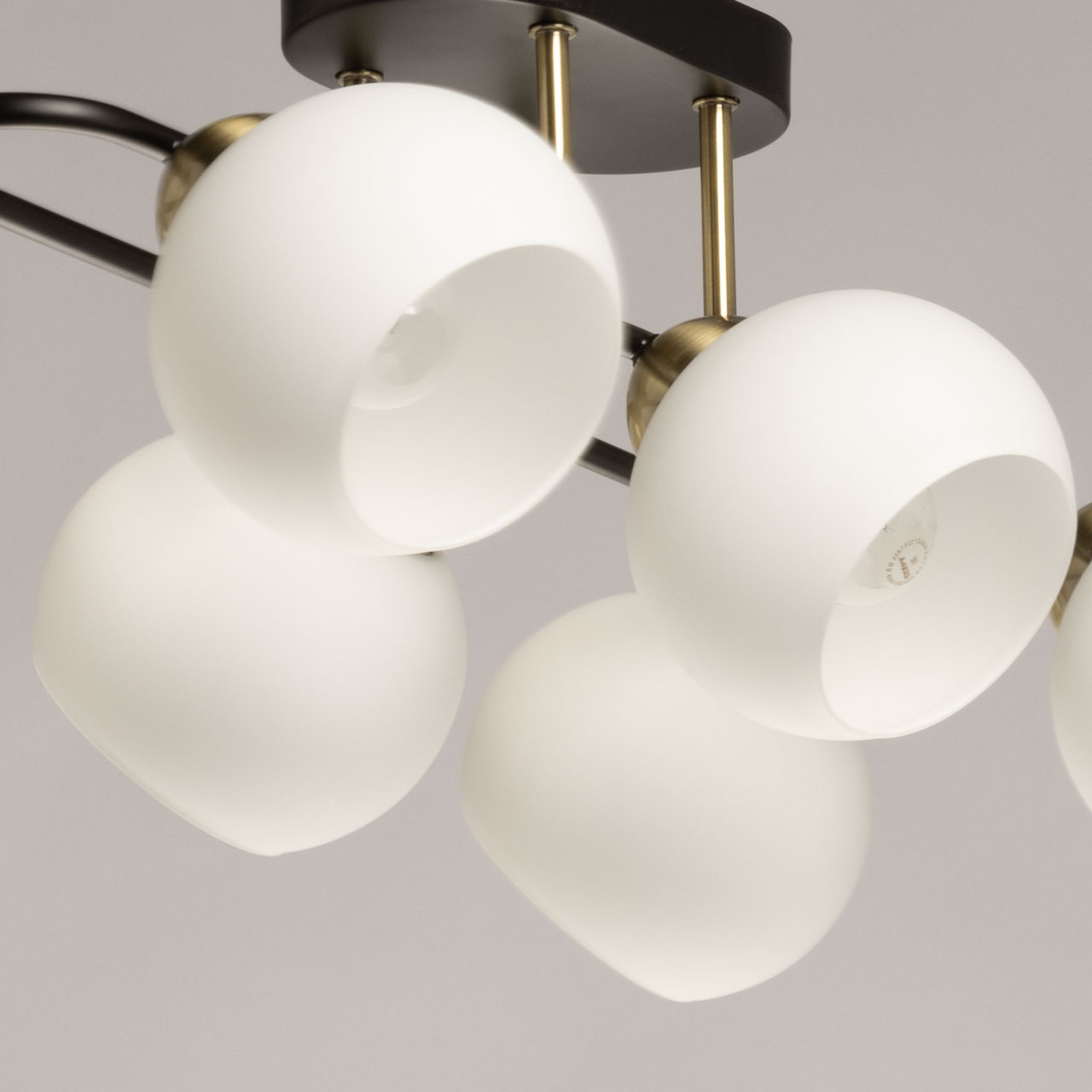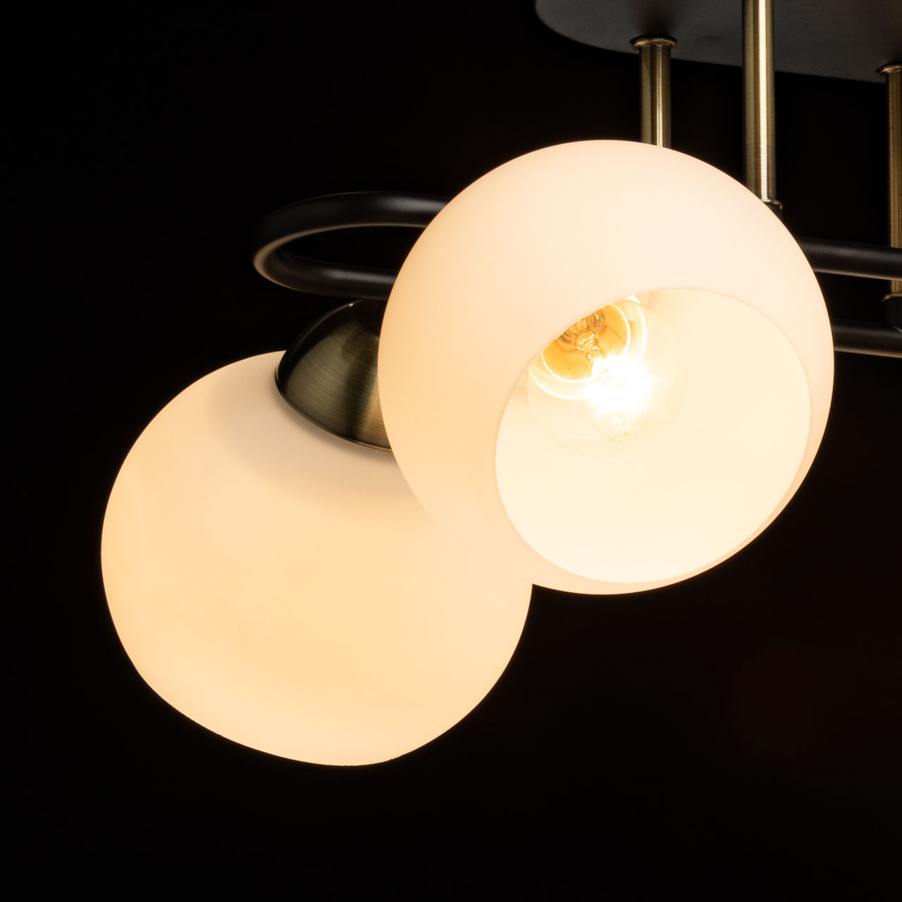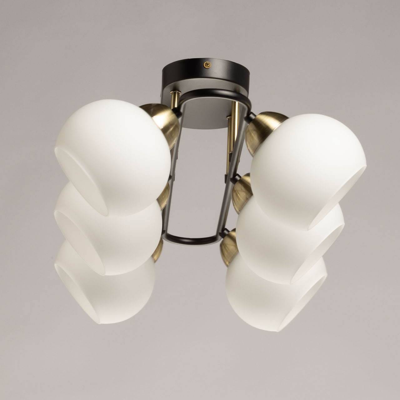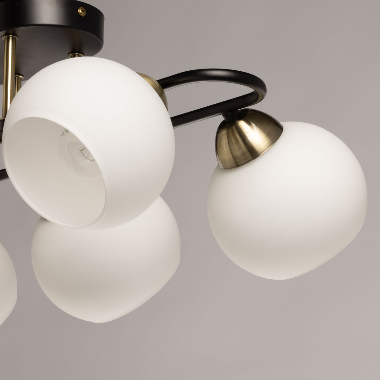 Металлическое основание потолочной люстры окрашено в черный цвет. Отдельные элементы гальванизированы в цвет античной бронзы. Светильник декорирован стеклянными плафонами белого матового цвета.