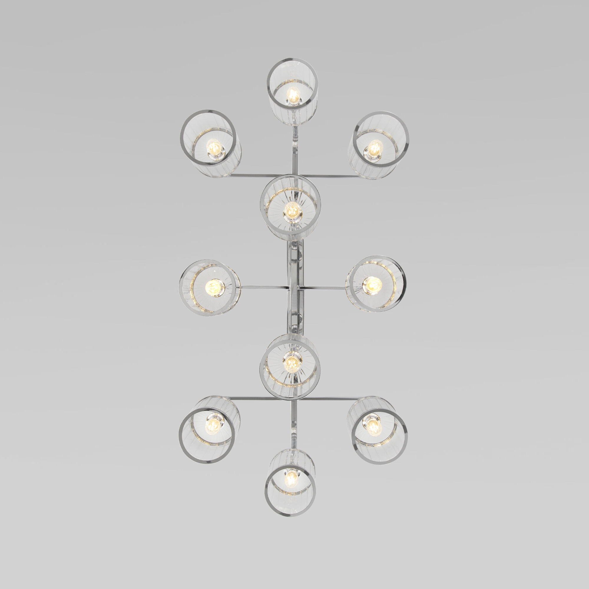 Люстра Inari в благородном цвете хром создана, чтобы стать центром визуального притяжения в современном интерьере зала, спальни или кухни. Изящный, но в то же время монументальный дизайн, который хочется рассматривать, обращая внимание на детали. Десять фактурных стеклянных плафонов мягко рассеивают свет, наполняя им максимум пространства за счет открытой конструкции. В потолочном светильнике используются сменные лампы с цоколем E14.