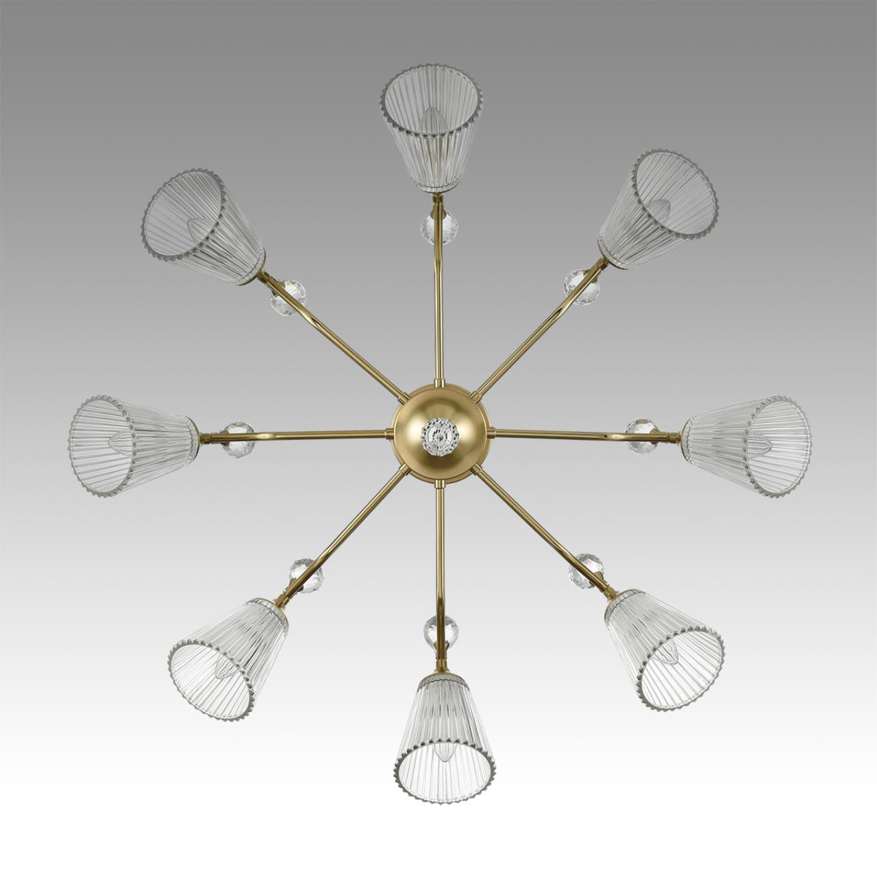 Классическая серия AURICA - это крупные стеклянные плафоны и основание цвета латунь. Изюминка этой люстры - большие хрустальные шарики, которые венчают рожки, добавляя блеска и лоска в интерьер. Прозрачные граненые плафоны изготовлены из толстого стекла с отличными оптическими свойствами, что в целом усиливает сияние светильника.