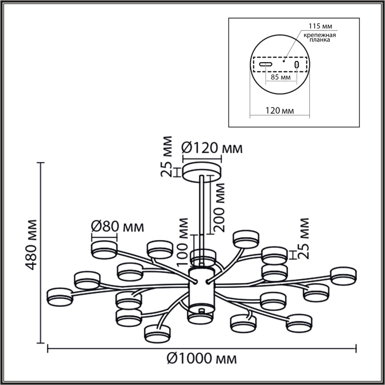 25 м2?Это примерное значение площади, которое может осветить данный прибор согласно мощности ламп рекомендованных производителем.