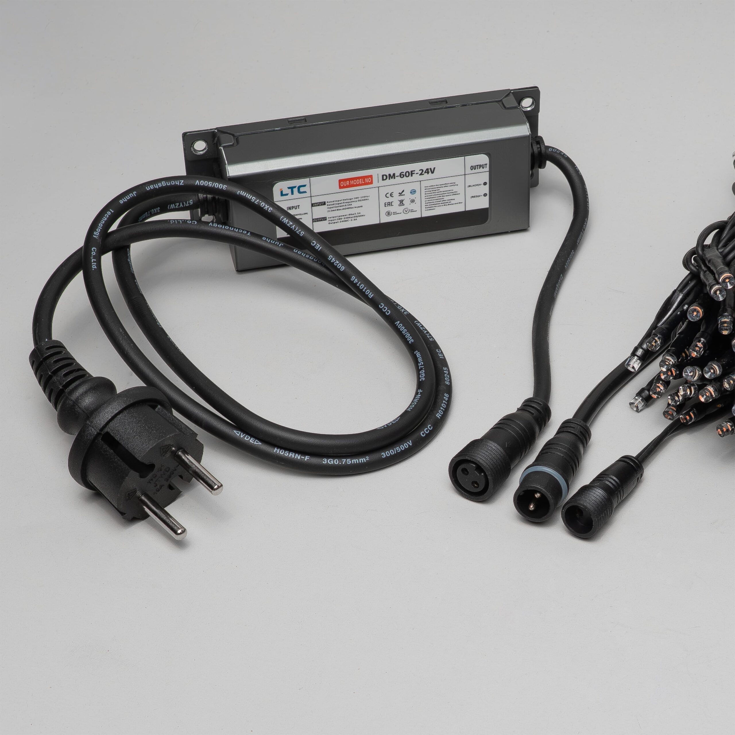 Купить "Комплект 5 Разноцветных Нитей по 20м, 1000 LED, Провод Черный Каучук 2,3мм, IP54 LTC ECO1000-1-1M"