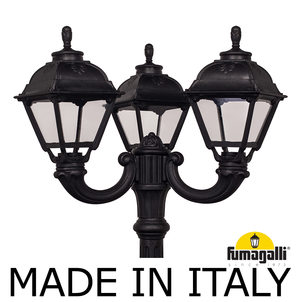 Садово-парковый фонарь FUMAGALLI среднего размера серии CEFA, модель RICU OFIR/CEFA 3L. Садовый светильник с 3 фонарями среднего размера CEFA на консолях среднего размера OFIR, установленных на столбе RICU высотой 2,0 м (+высота фонаря). Предназначен для освещения парковых дорожек, cкверов, садовых и ландшафтных композиций, и других общественных пространств. Используется в качестве основного уличного освещения на городских улицах и площадях. Изготовлены в Италии, по уникальным технологиям "FUMATECH" из современного композитного полимера RESIN. Этот материал в 5 раз прочнее металла, не ржавеет, не окисляется, не выгорает на солнце, его не нужно красить. Все светильники пыле-влаго защищены по стандарту IP55 (Пылезащищенные, защита от водяных струй с любого направления). Рассеиватель выполнен из антивандального, не мутнеющего и не горючего PMMA (ПолиМетилМетаАкрилат). Срок службы светильника - не менее 20 лет. Температура использования от -60 до +90. В серии CEFA есть садовые фонари в настенном (OFIR/CEFA, MIRRA/CEFA) подвесном (SICHEM/CEFA) и наземном исполнении (IAFAET.R/CEFA, ALOE.R/CEFA, ARTU/CEFA, GIGI/CEFA, RICU/CEFA, NEBO/OFIR/CEFA 1L, NEBO/OFIR/ANNA 2L, TABOR/ADAM/CEFA 3L) со столбами разной высоты, с разным количеством и конфигурацией голов. Консоли настенных фонарей и кронштейны светильников на столбах освещения могут устанавливаться в положение вверх и вниз. Столбы выше 150 см имеют в основе мощную стальную трубу с двойной оцинковкой. При заказе требуется выбрать цвет корпуса, цвет плафона и тип патрона (Е-27 или LED GX-53). Возможен светодиодный вариант. По стилю и дизайну серия уличных светильников CEFA похожа на светильники большого размера серии SIMON . По размеру относится к средним парковым светильникам как серия RUT и GLOBE 300.