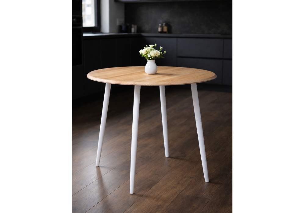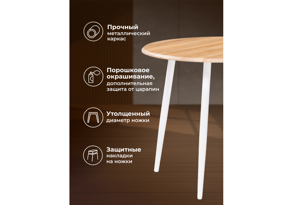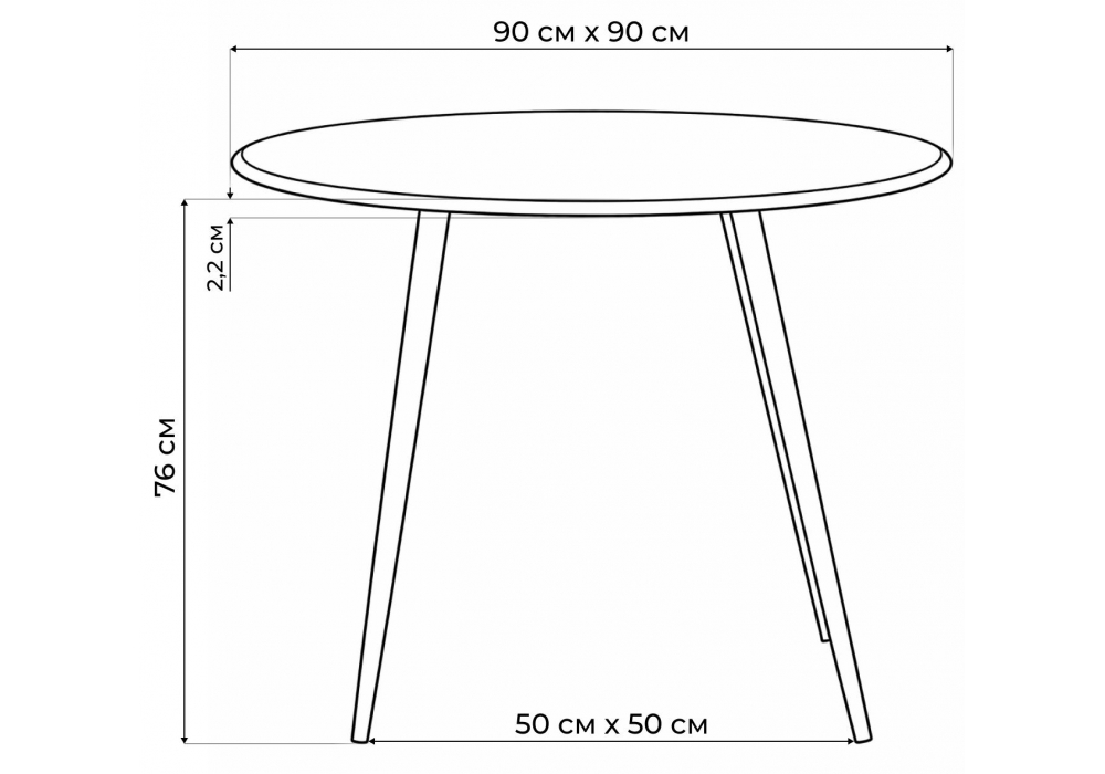 Толщина столешницы: 2,2 см. Материал каркаса - металл; Материал столешницы - МДФ; Цвет ножек - белый; Ширина - 90; Высота - 76; Длина - 90;